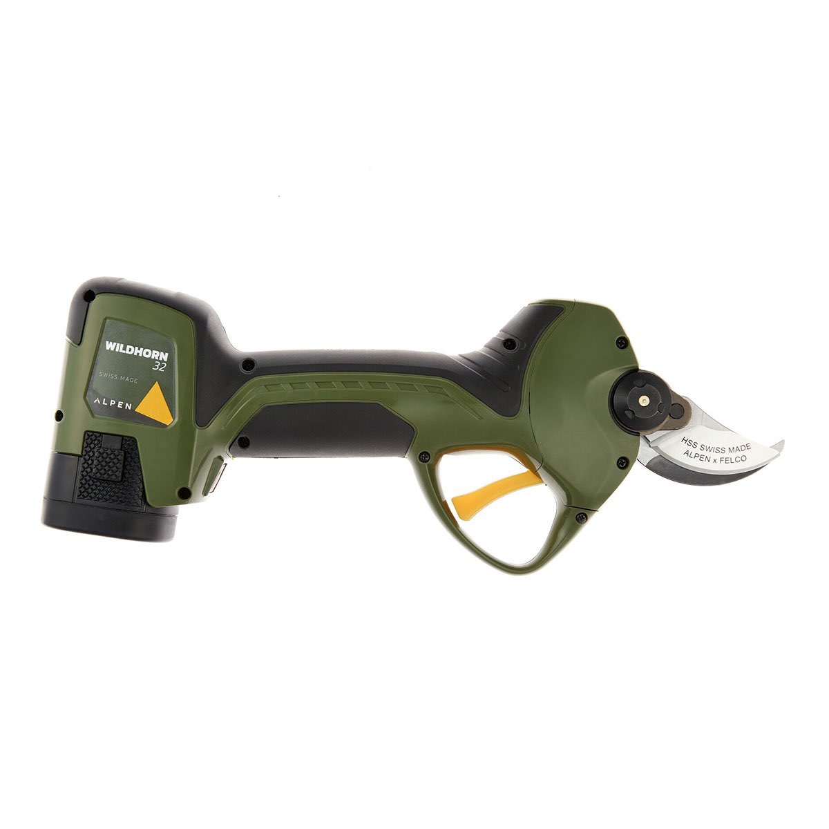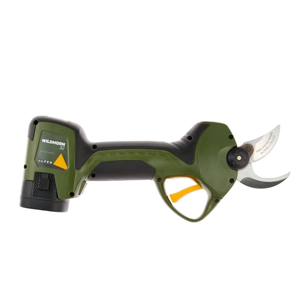 Topkvalitet til meget rimelige penge! Alpen Wildhorn 32 er en handy lille, elektrisk beskæresaks på batteri. Wildhorn 32 er velegnet til såvel den professionelle bruger som den private haveejer med et behov for effektiv beskæring. Den vejer kun 940 gr. inkl. batteri og bliver leveret i en stødabsorberende transportkasse.
