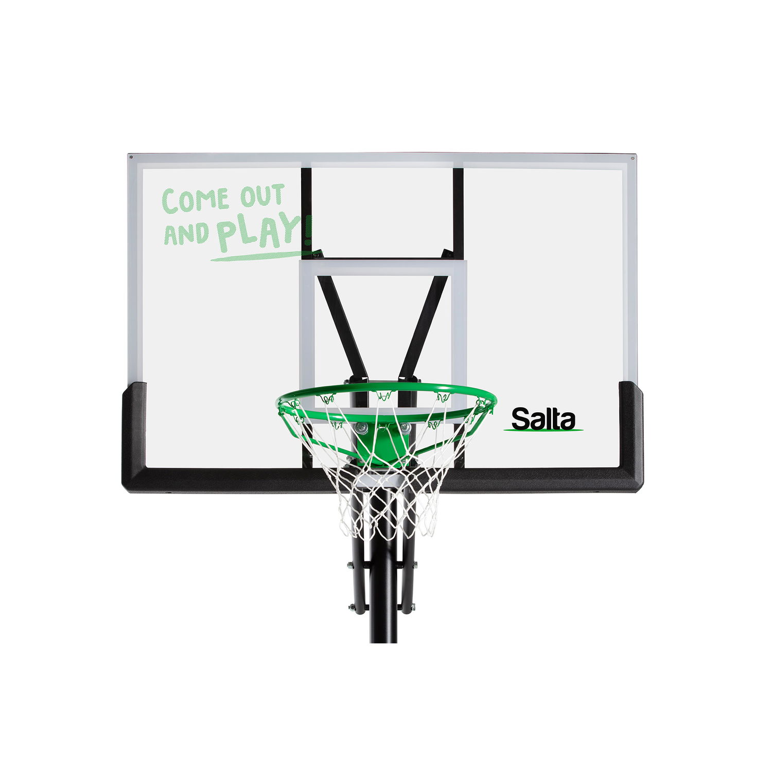 Basketball bagpladen på Salta Center består af et kraftigt stålstel med en gennemsigtig polycarbonatplade. Basketball standeren er galvaniseret og har en mat sort pulverlakering. Stålkurven er med dobbelt kompressionsfjeder og dermed ideel til at lave ægte slam dunks!