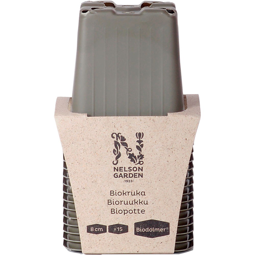 Biopotterne er 8 cm, har drænhuller og én pakke indeholder 15 stk.
