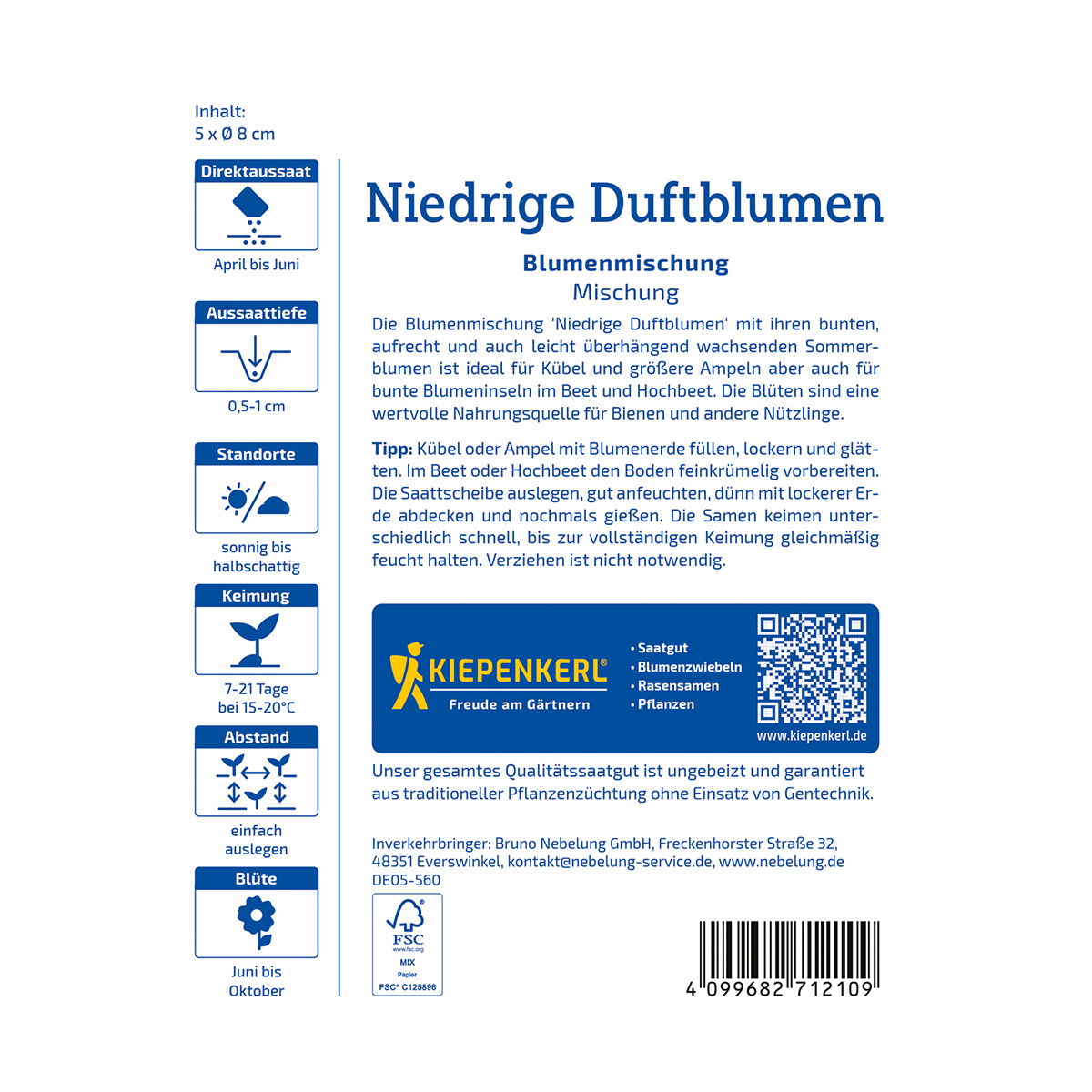 Blomsterblandingen Duftblomster leveres som praktiske såskiver og gør det nemt at skabe farve og duft i krukker, altankasser og højbede. Pakken indeholder 5 såskiver, som sikrer en jævn fordeling af blomsterfrøene og gør såningen enkel .