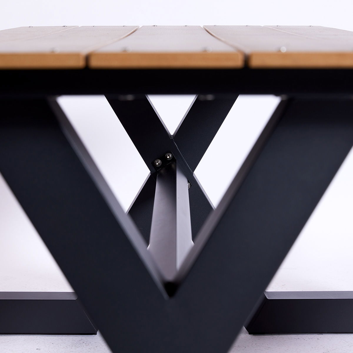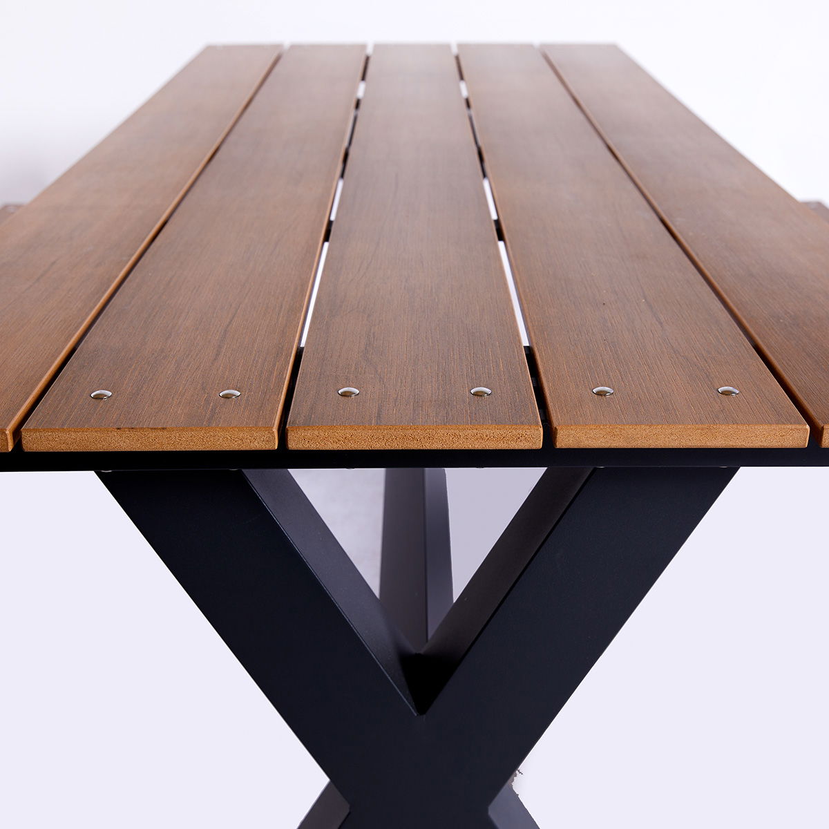 Bord-/bænkesæt med et klassisk design, der er praktisk og velegnet til både hjemmet, sommerhuset og institutionen. Bordet har kraftige X-formede ben i aluminium, der sikrer holdbarhed og god benplads, der gør det nemt at bruge for alle.