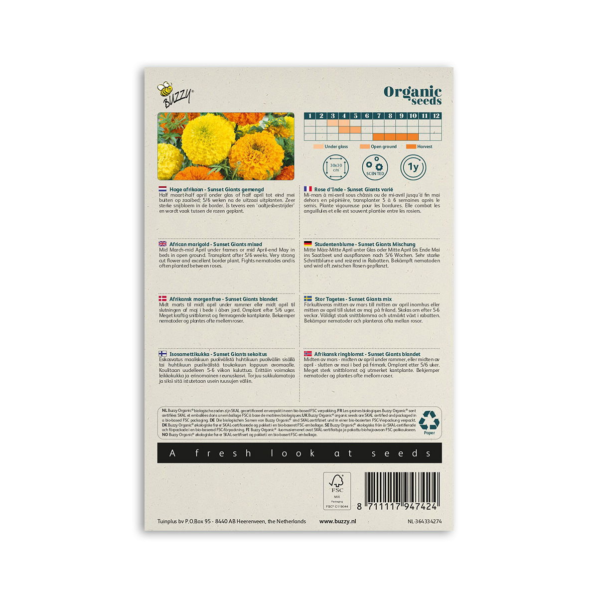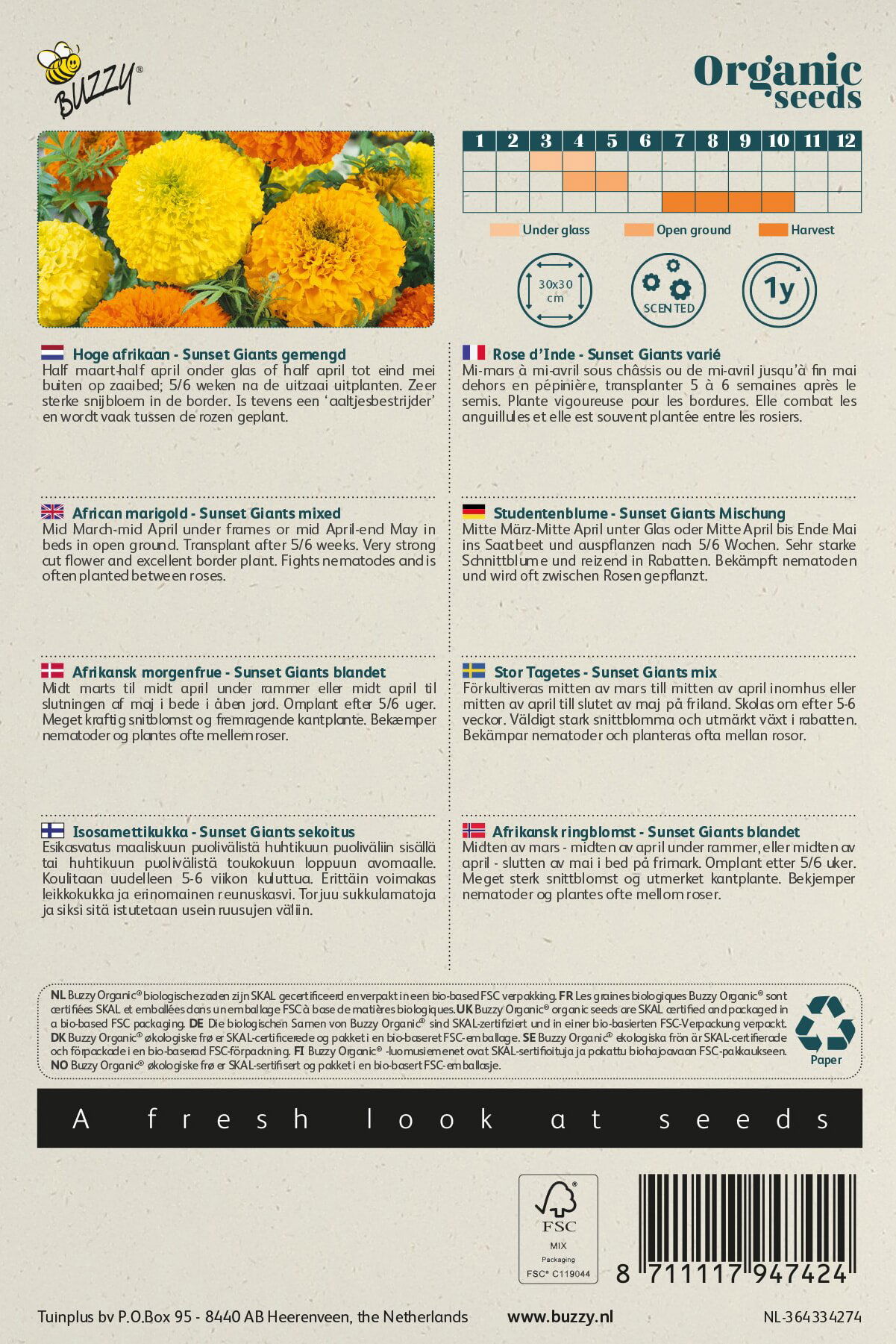 Tagetes morgenfrue frø, er en unik sort der springer ud med store orange og gule blomster i en rund kransform. Blomsten er med mange små tætte og krøllede blade. Planten bliver op til 80 cm høj.