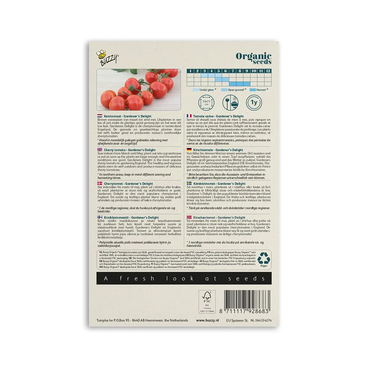 Gardener's Delight tomatfrø, er en cherrytomat, der også kaldes for kirsebærtomat, da tomaterne ligner små kirsebær. Tomaten har sin klassiske røde farve og mindre runde facon.