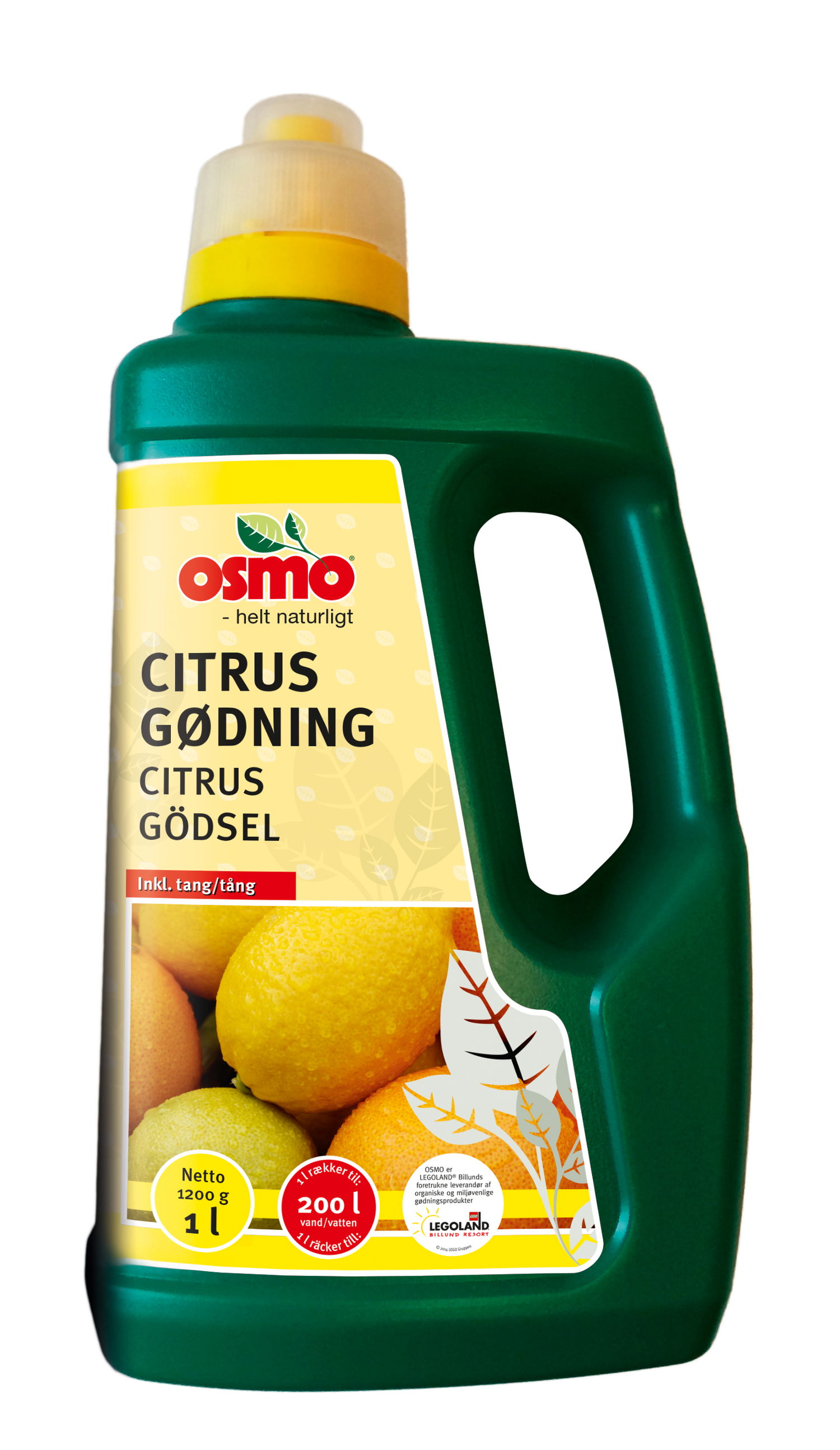 Osmo Citrus Gødning er en flydende NPK-gødning 7-2-5 som er tilsat tang og ekstra jern. Gødningen sikrer flotte farver og en od væks til dine citrusplanter. Brug gødningen til citroner, appelsiner, klementinter og kumquat