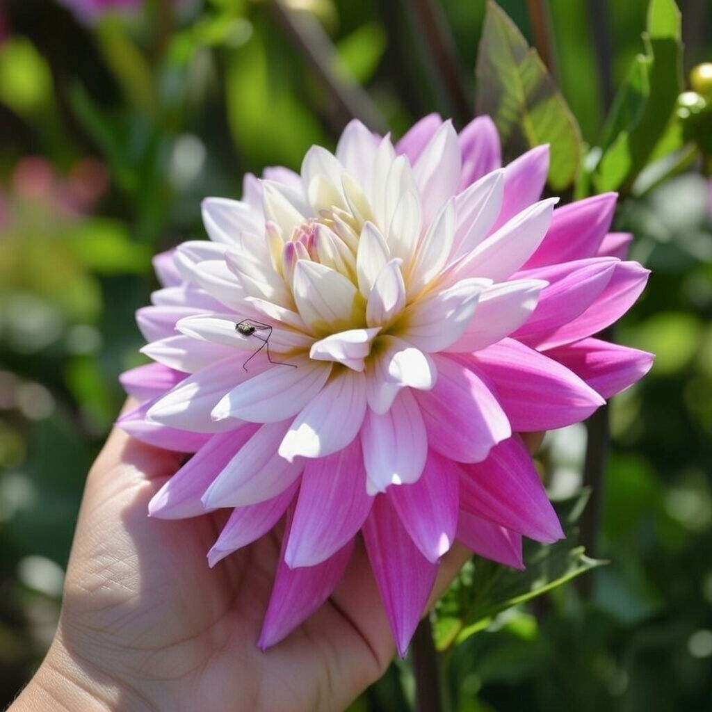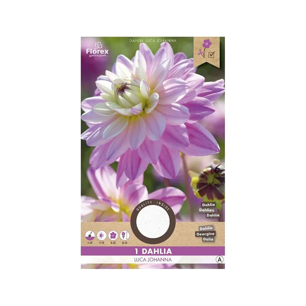 Dahlia Luca Johanna har en særlig farvekombination med hvid i midten af blomsterhovederne, der gradvist skifter til en blød rosa farve og over i dyb lilla ved kronbladenes spidser. Blomsterne er perfekte snitblomster, hvor du kan skabe de smukkeste buketter.