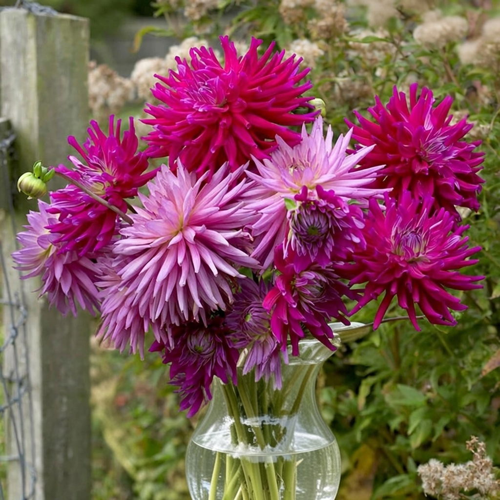 Dahlia Cactus Ofreo kommer med virkelig store blomster (op til 15 cm) og ser næsten ud som skinnende kaktusser. Dahlia/ georginer har lange stilke, og kan med fordel sættes i vaser. Så sørg for at plante nogle ekstra, så du kan lave smukke buketter.