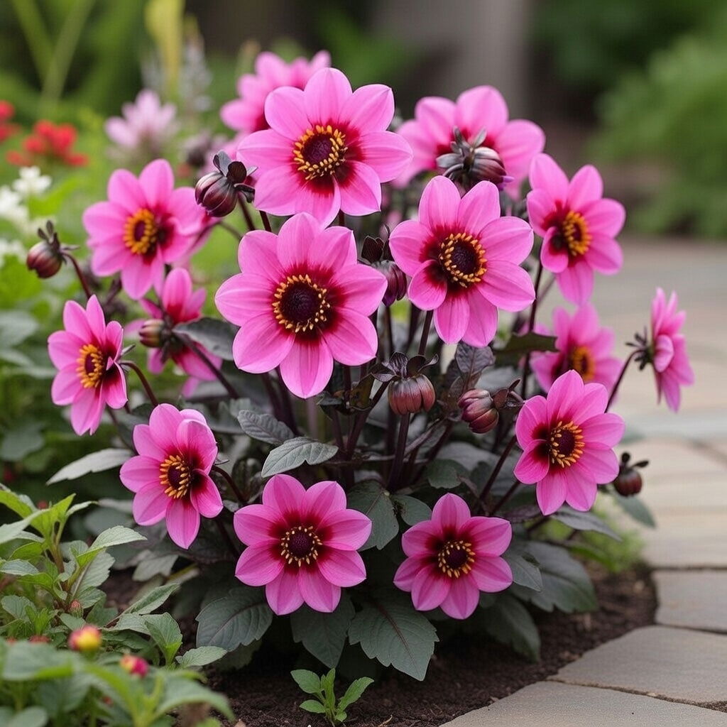 Denne lave rosa dahlia blomstrer flittigt fra juli til oktober og egner sig godt til bede, kanter og altankasser. De mange blomster dækker planten tæt og giver et pænt, samlet udtryk.