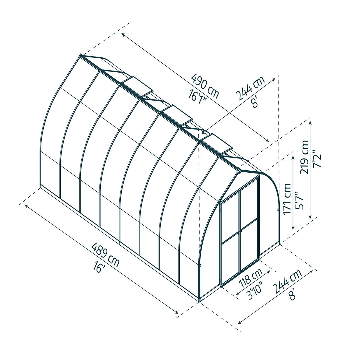 Bella 12 m² drivhuset har en bredde på 2,4 meter og et klokkeformet design, der giver ekstra plads og forbedret vindmodstand. De brede dobbeltdøre og høje indgang gør det nemt at arbejde inde i drivhuset, flytte planter eller opbevare værktøj.