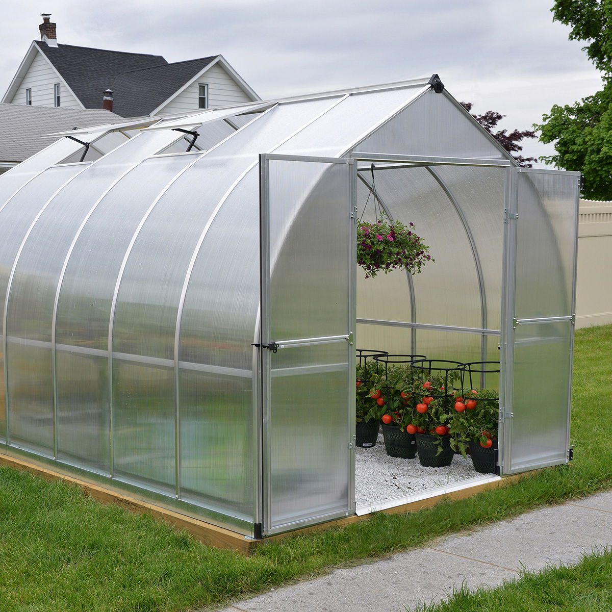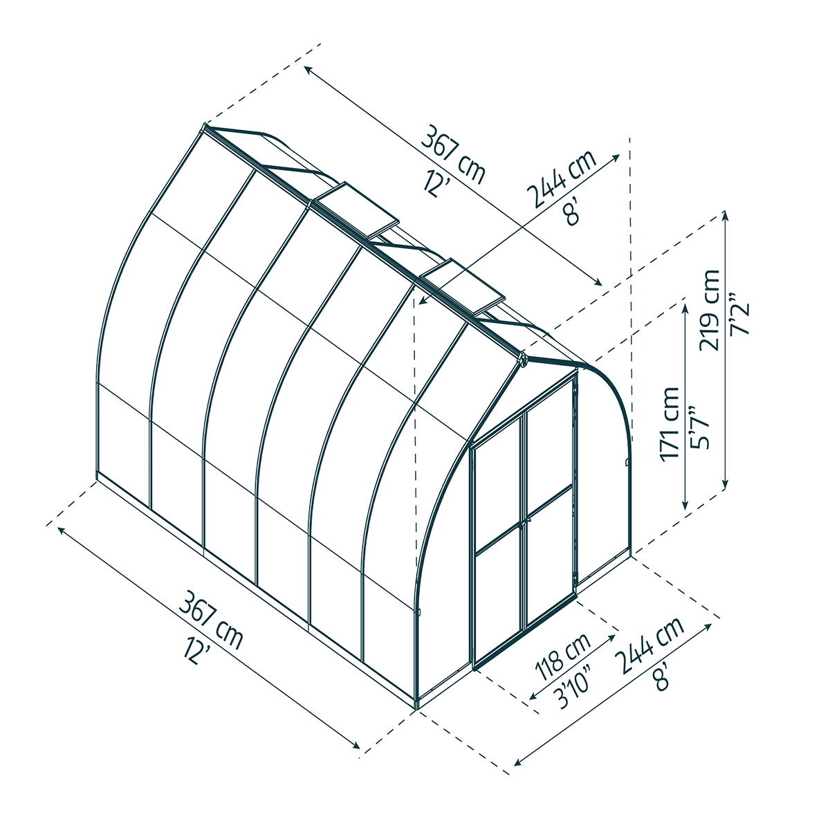 Bella 9 m² drivhuset har en bredde på 2,4 meter og et klokkeformet design, der giver ekstra plads og forbedret vindmodstand. De brede dobbeltdøre og høje indgang gør det nemt at arbejde inde i drivhuset, flytte planter eller opbevare værktøj.