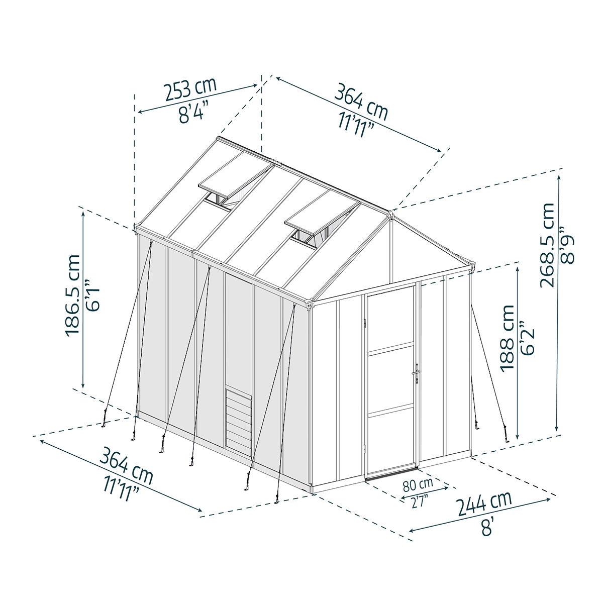 - Udvendige mål: H 268,5 x B 253 x D 364 cm
