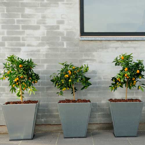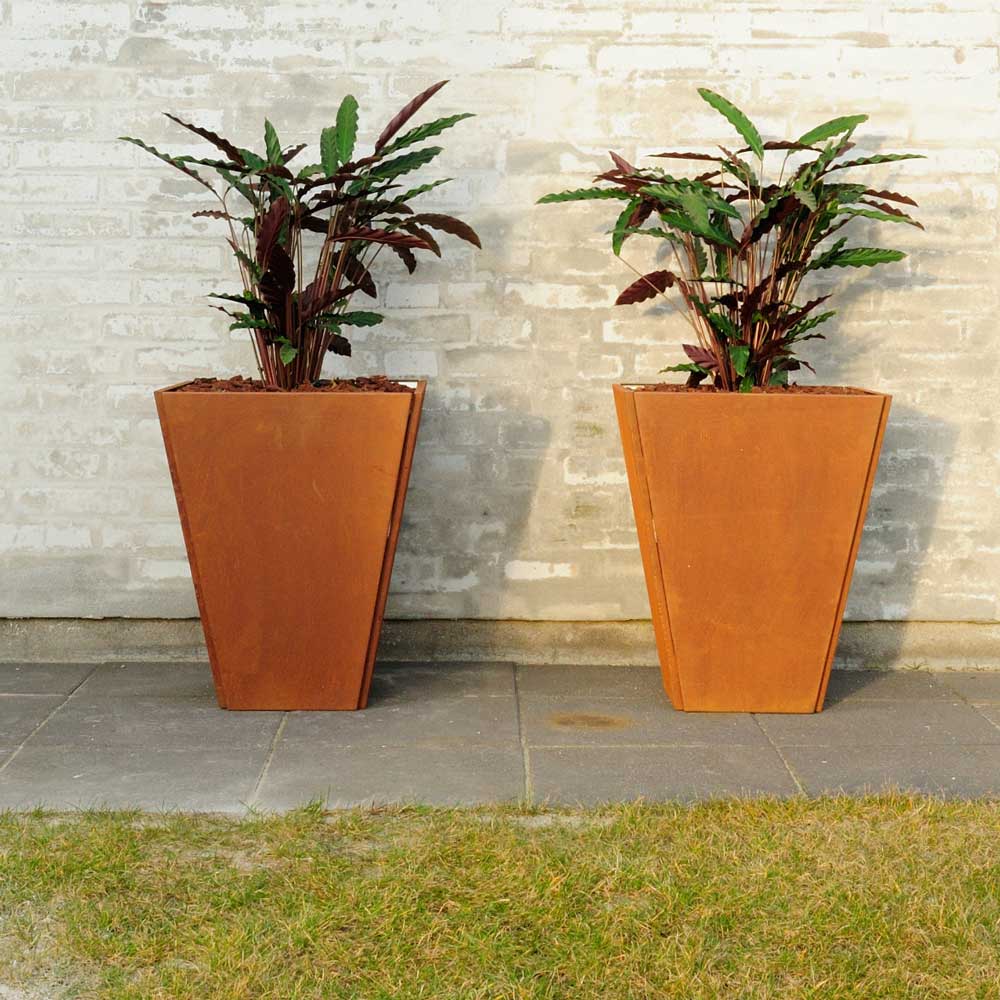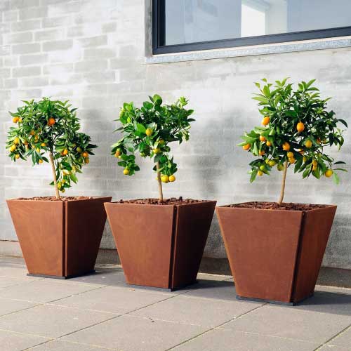 Det krukkede højbed! Skab firkantede krukker med bred kant, pyramider med bred bund eller en dekorativ kombination. Leveres i galvaniseret jern og råjern, der får en flot rusten overflade. Fås i 2 størrelser: lille (højde 38 cm, bundmål 25 x 25 cm, topmål 40 x 40 cm) og stor (højde 55 cm, bundmål 25 x 25 cm, topmål 45 x 45 cm). Fås også som mobil plantekrukke med 4 hjul. Uden bundplade, men kan tilkøbes under bundplader – vælg 25x25cm.