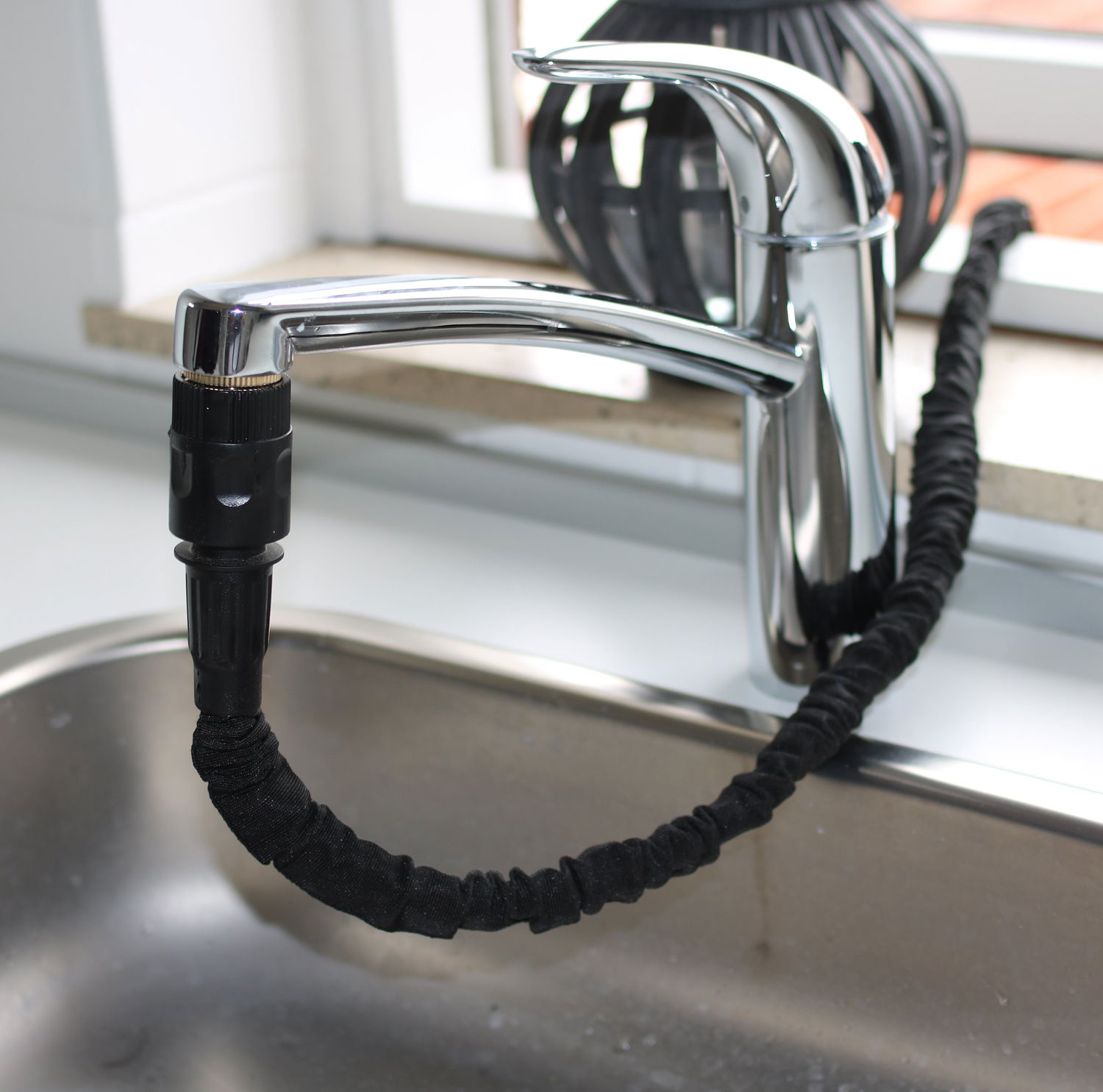 Hortus Flex haveslange med kobling og adapter, så du nemt kan koble haveslangen til køkken- og havevandhanen.