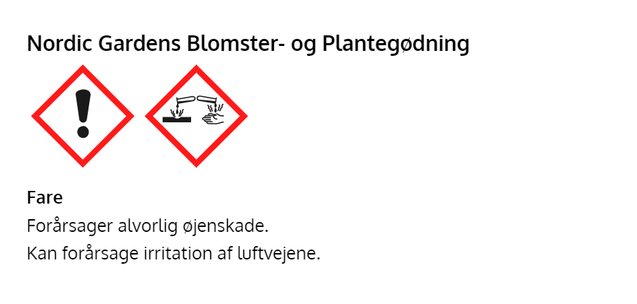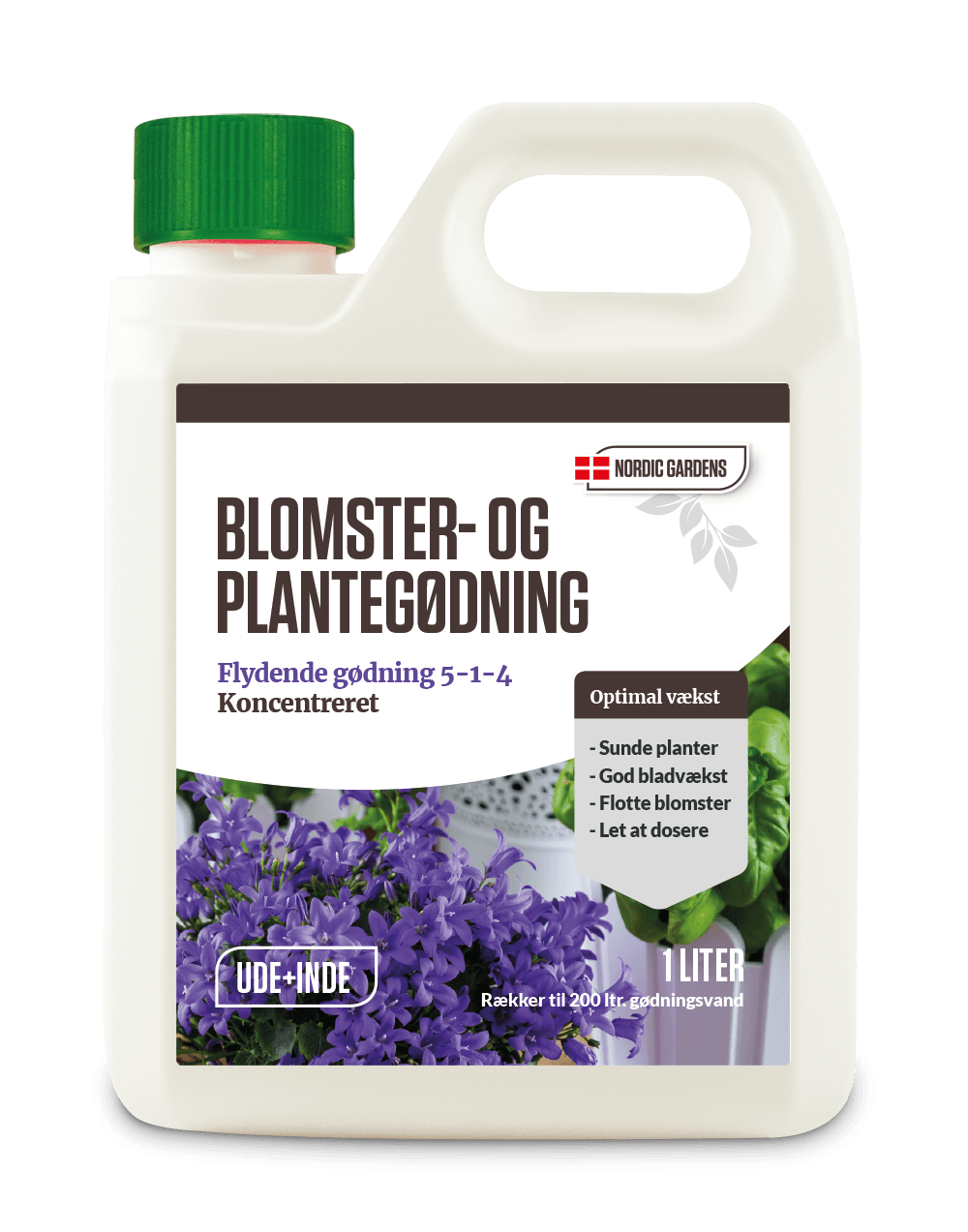 Sammensætning: Flydende NPK gødning 5-1-4. 1 liter Nordic Gardens blomster- og plantegødning rækker til 200 liter gødningsvand. Opbevares frostfrit.