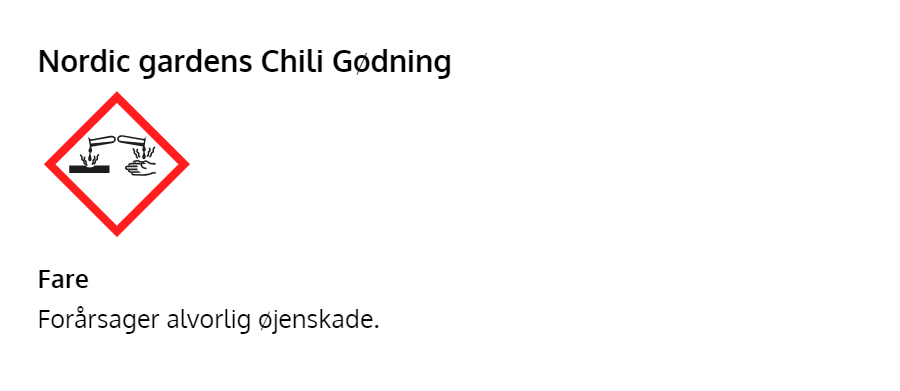 Sammensætning: 300 ml. Flydende NPK gødning 2-2-2. Nordic Gardens chiligødning rækker til 60 liter vand. Opbevares frostfrit.