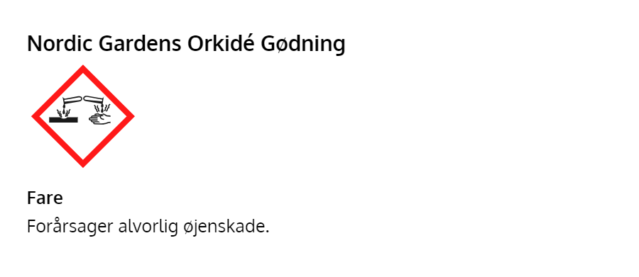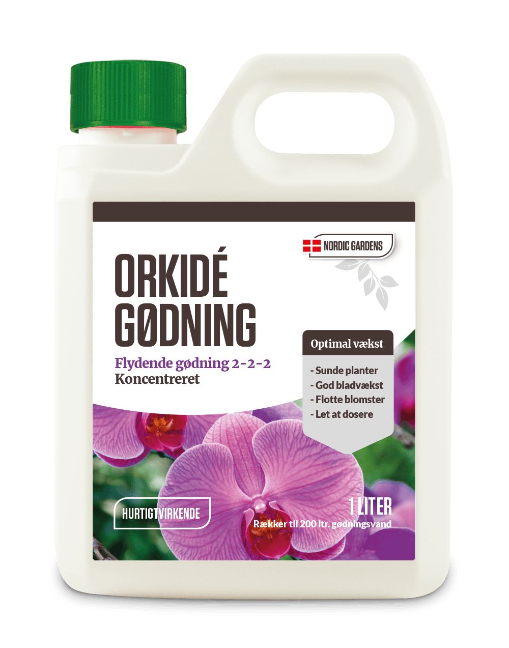 Sammensætning: Flydende NPK gødning 2-2-2. 1 liter Nordic Gardens orkidégødning rækker til 200 liter vand. Opbevares frostfrit.