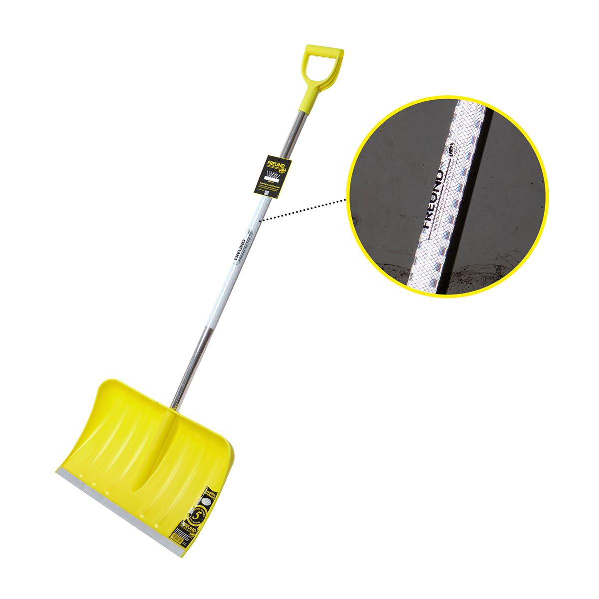 Freund “REFLECTION” er en professionel sneskovl der er udviklet til maksimal synlighed og sikkerhed i vintermørket. Det neon-gule plastblad og det ovale aluminiumsskaft med refleksfilm gør dig tydeligt synlig nær vejtrafik – ideelt ved snerydning i morgentimerne eller aftenskumringen.
