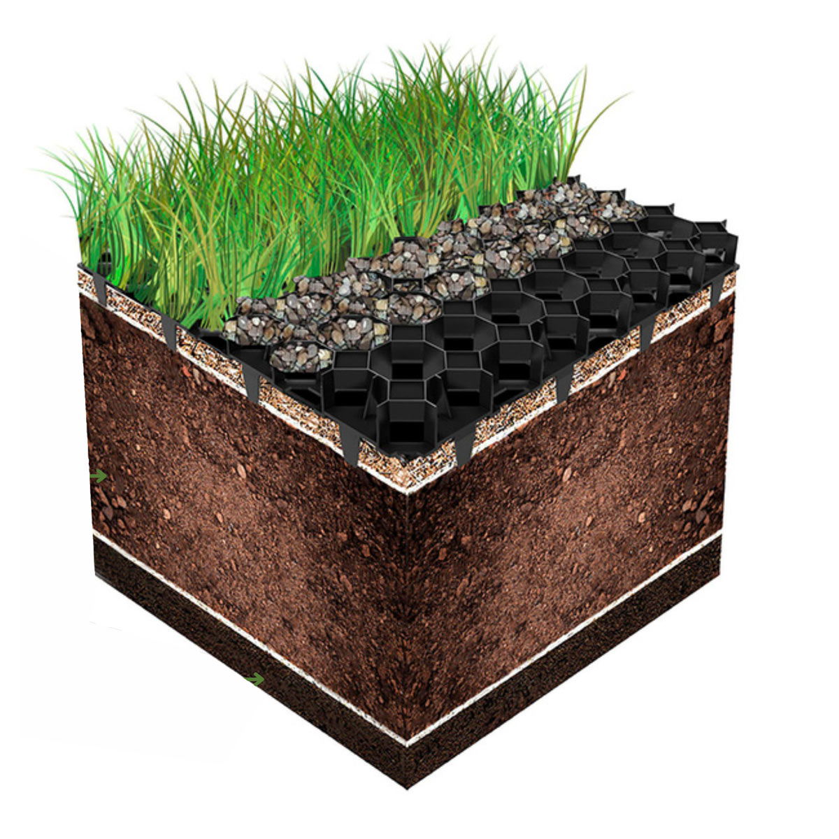 Fremstillet i holdbart plast og kan let sættes sammen med yderligere plader græsarmering. En plade græsarmering svarer til et areal på 490 x 490 x 40 mm og vejer ca. 1 kg.