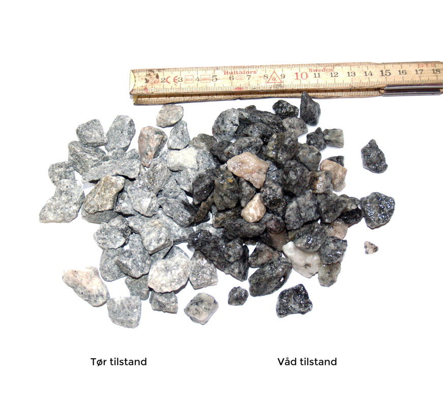 På billedet ses skærverne lettere fugtige, så du bedst kan bedømme deres farvespil. I tør tilstand skal du regne med et lysere helhedsindtryk. Bemærk at granit er et naturmateriale, så der vil altid være lidt variation i farve og struktur. Det er ikke en fejl, men en del af produktets naturlige udtryk. Ved modtagelsen kan fremstå støvede. Det skyldes støvet fra knusning og forsvinder når det har regnet et par gange.