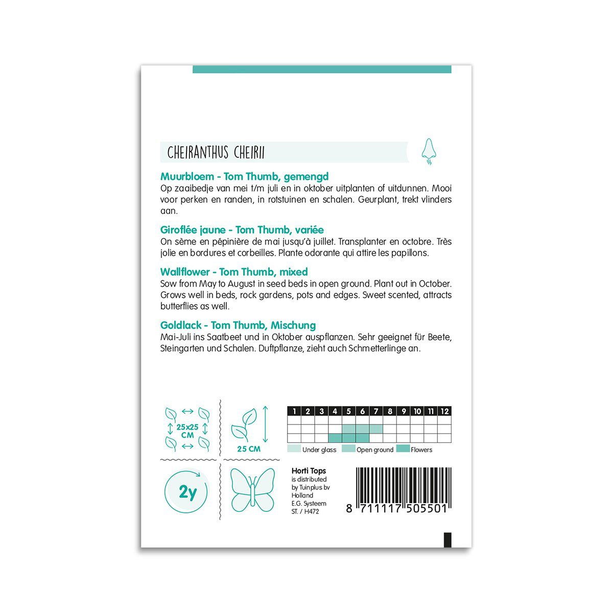 Gyldenlak Tom Thumb, udvikler sig til en smuk blomst, med store blade i flere forskellige farver og nuancer, heriblandt gul, rød, lilla og pink. Planten bliver ca. 25 cm høj, og har en sød og behagelig duft.