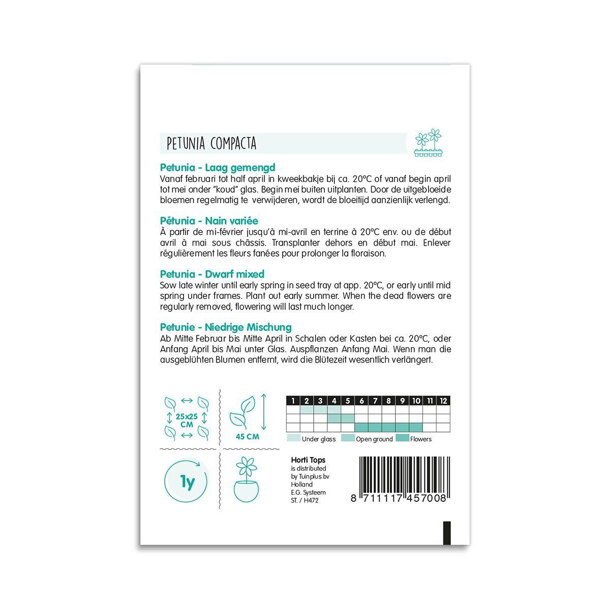 Petunia blomsten bliver omkring 45 cm høj, og skal sås med en plante- og rækkeafstand på 25 cm.