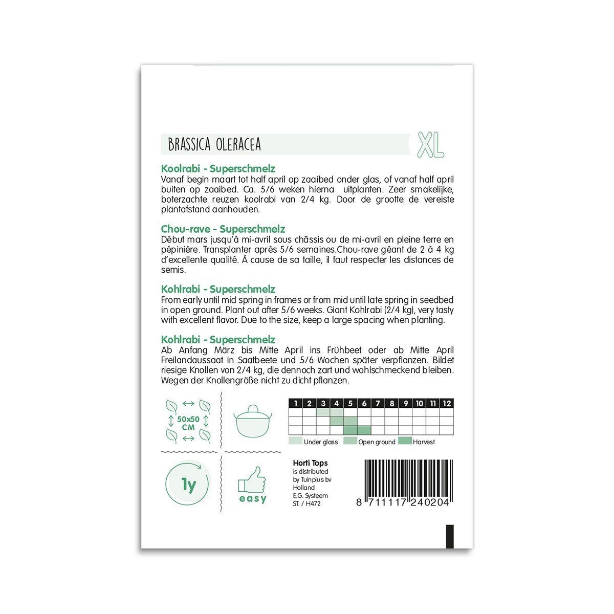 Kålrabi har et helt specielt udseende med sin runde knold, der stikker op af jorden. Kålrabi Superschmelz er lysegrøn og meget stor, og kan komme op og veje ca. 4 kg.