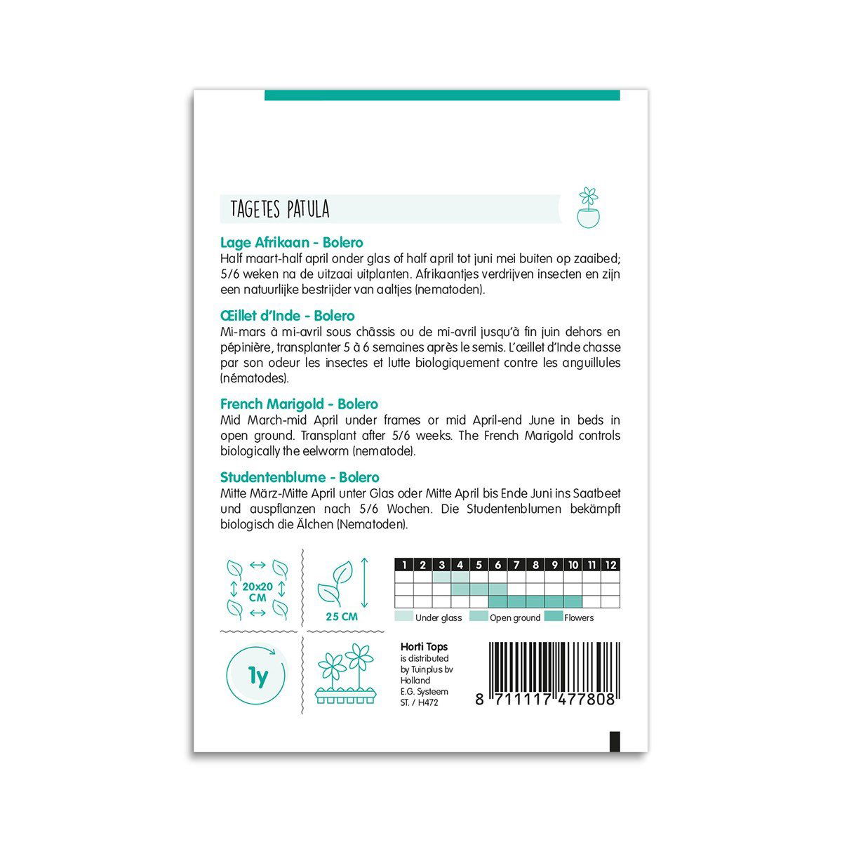 Tagetes Bolero er en farverig blomst, som har et fyldigt udtryk og skønne farver af gyldne og orange nuancer. Planten bliver ca. 25 cm høj, hvilket gør den velegnet til at dyrke i krukker, altankasser og blomsterbede.