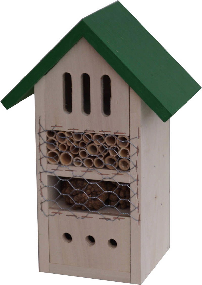 Insekt hotel Marie fra GardenLife er lavet i naturtræ med grønt tag.
