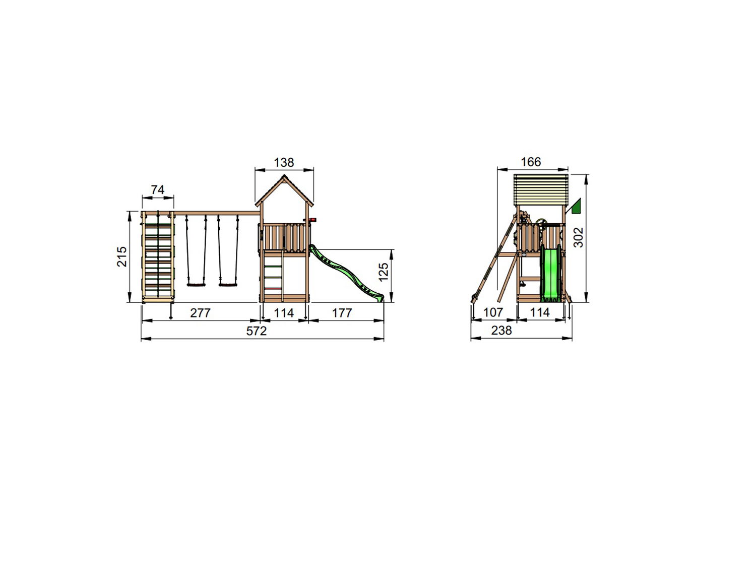 Areal ekskl. sikkerhedsareal legetårn: B:303 x D:166 x H: 302 cm