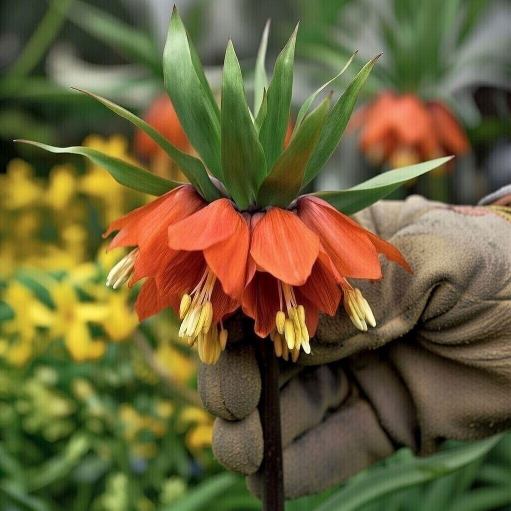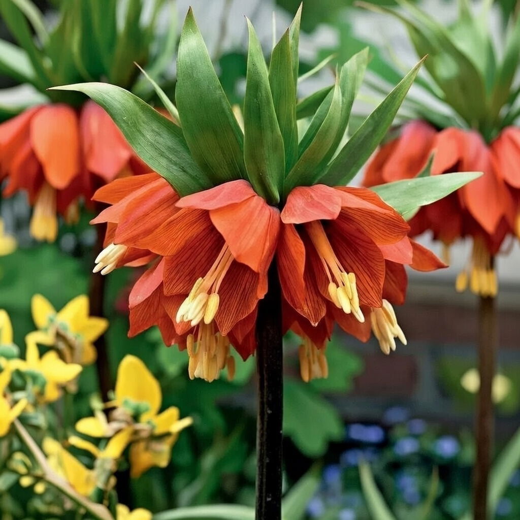 Kejserkronen “Rubra” er en imponerende flot kejserkrone, der når en højde på 90 cm. Udover plantens størrelse er den også bemærkelsesværdig på grund af blomstens farve. Den giver 5 til 10 store orangerøde blomster pr. stilk, der skiller sig smukt ud mod de friske grønne blade øverst på planten.