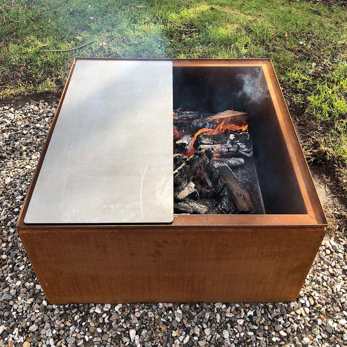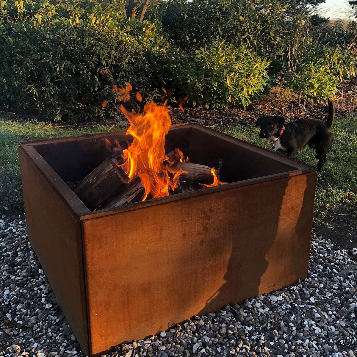 Bålstedet er konstrueret af solidt 2 mm Cortenstål og leveres med en matchende ramme fremstillet af samme materiale, som det sikkert hviler på.