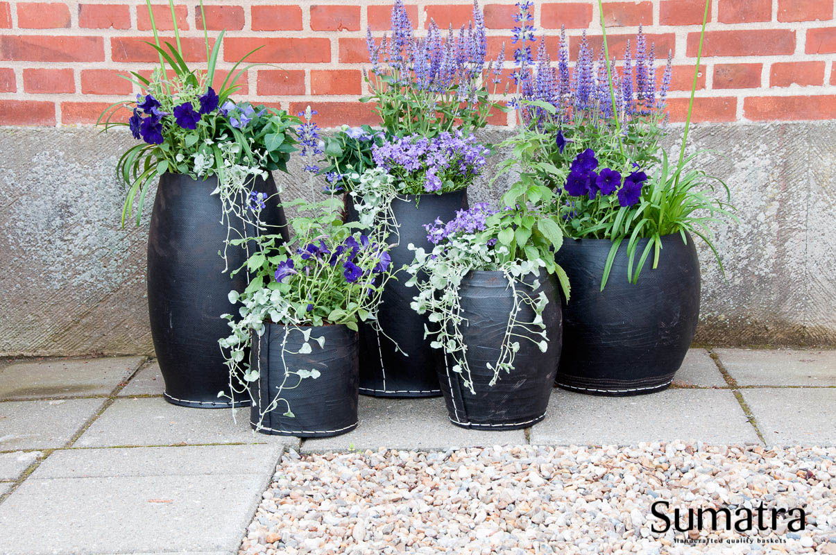Sæt et glas i gummikurven og du har en rigtig flot urtepotteskjuler eller vase på terrassebordet. De er lige velegnet til at stå ude som inde. Kurvene er fremstillet i genanvendt gummi og alle kurve er unikke.