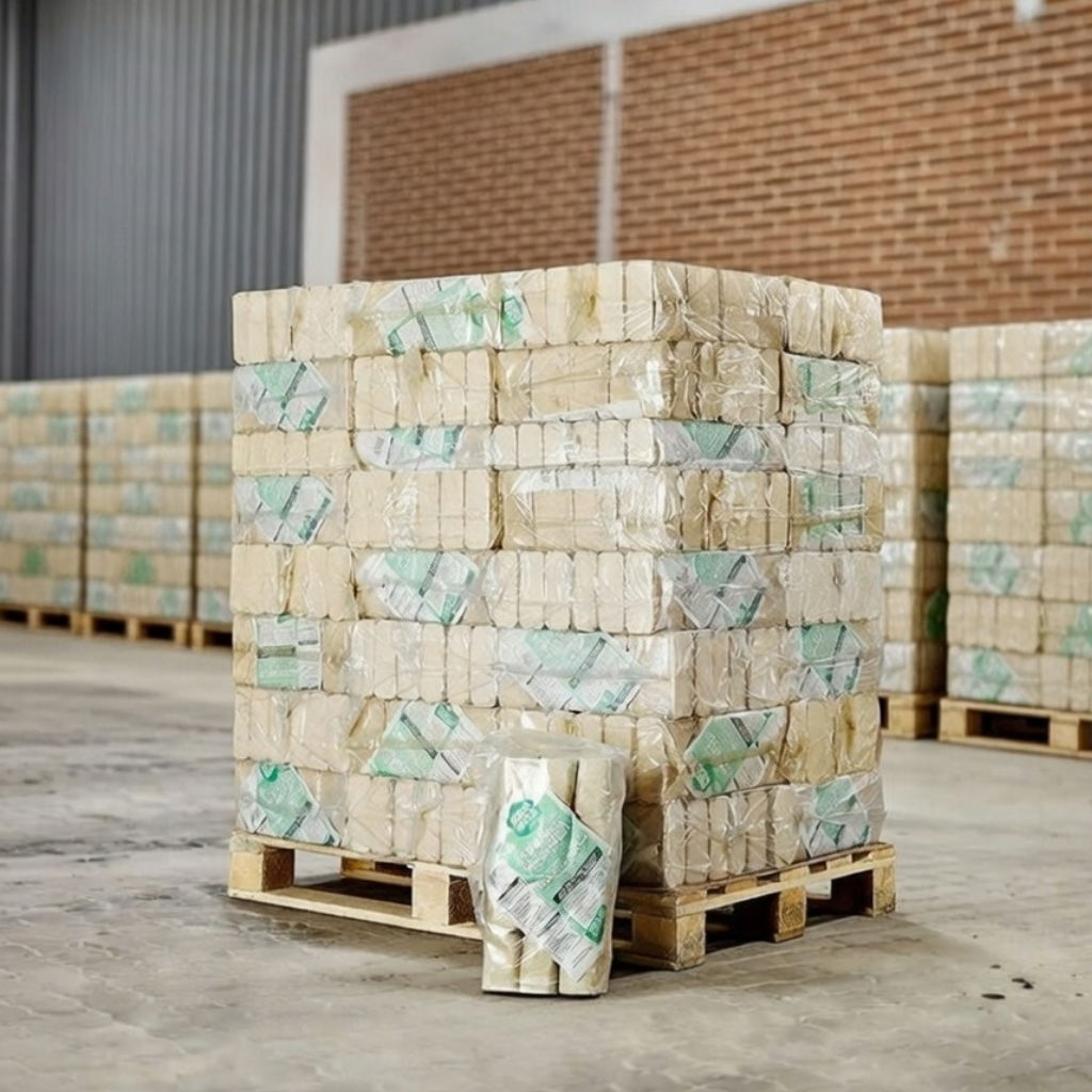 ØKO-BRIK briketter er praktisk pakkede i poser af 10 kilo, så de både holdes tørre og er lette at håndtere. Der er 12 briketter i hver pose. Der er 96 poser på en palle, så man får dermed cirka 960 kg. god brændsel. ØKO-BRIK er en formstabil briket, der næsten ikke smuldrer og som stort set ikke efterlader aske ved forbrænding.