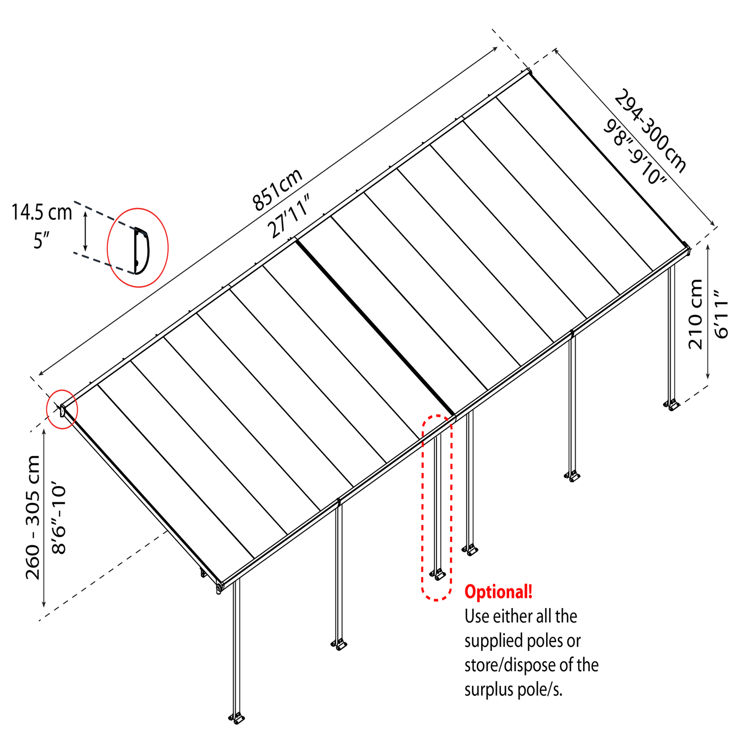 •Terrasseoverdækningen har følgende mål: B: 851 x D: 295 x H: 260-305 cm