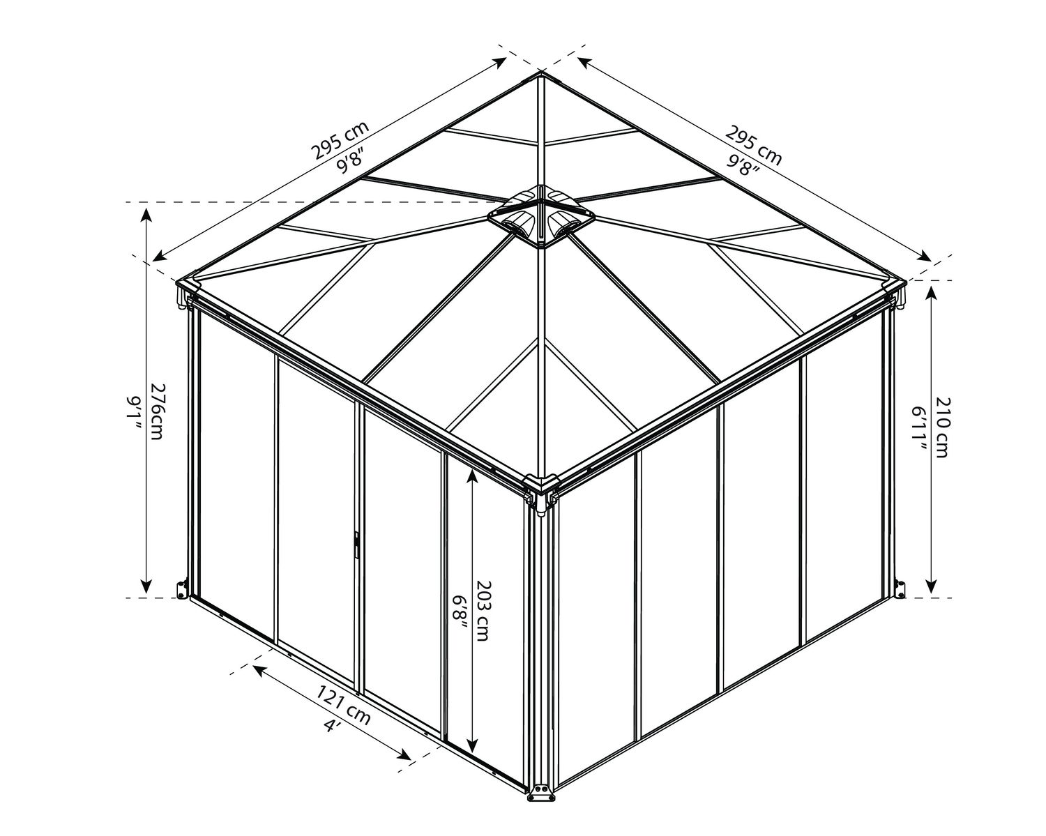 •Havepavillonen har følgende udvendige mål: B: 295 x D: 295 x H: 276 cm