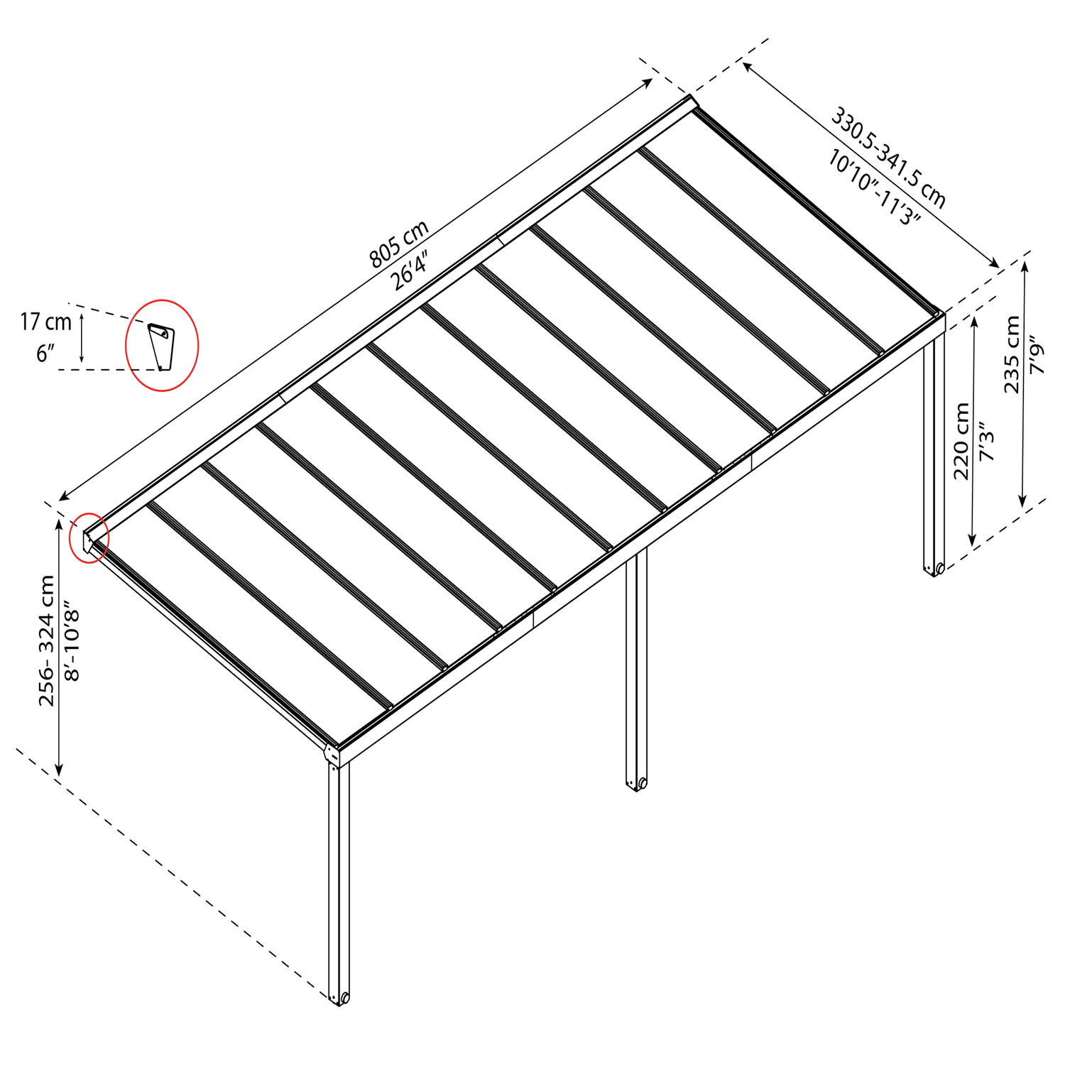 Terrasseoverdækningen har følgende dimensioner: B: 810 x D: 330,5-341 x H: 256,5-324 cm