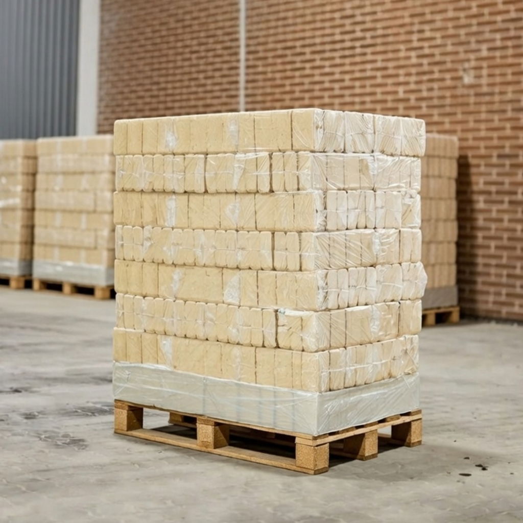 RUF briketterne er pakket med 10-12 stk. briketter pr. pose, som giver i alt 10 kg. pr. pose. Der er 96 poser på en palle, så man får dermed ca. 960 kg. god brændsel.