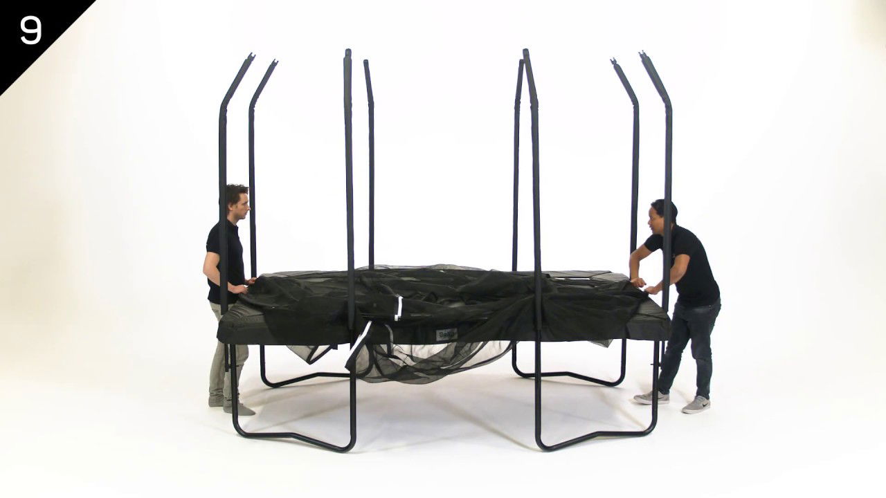 Der medfølger sikkerhedsnet og kantmåtte til trampolinen.
