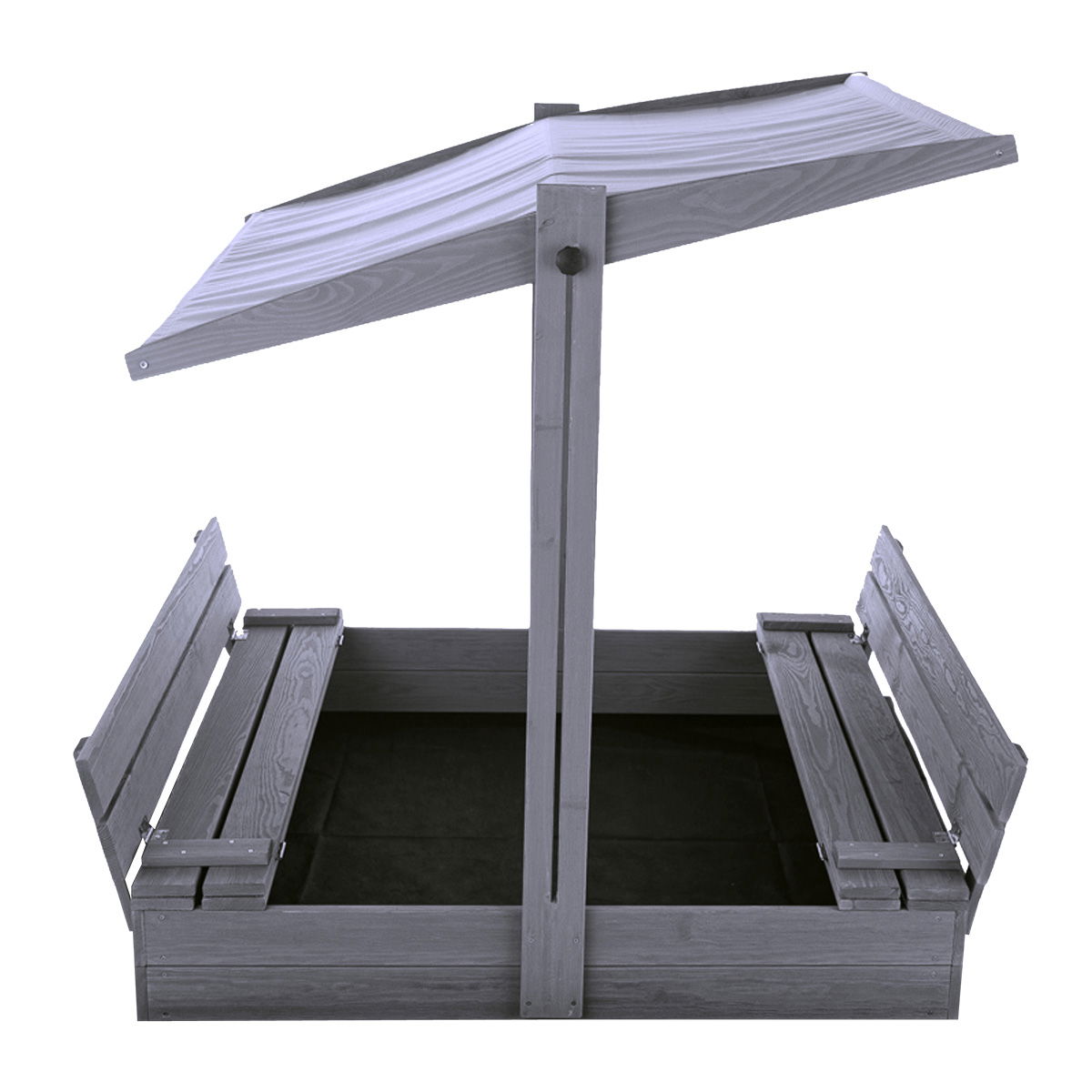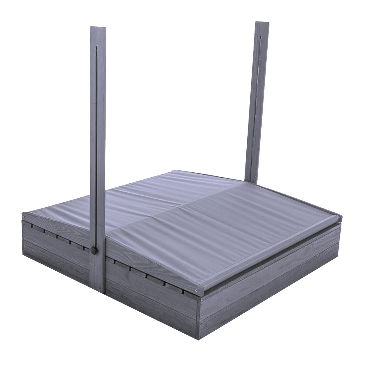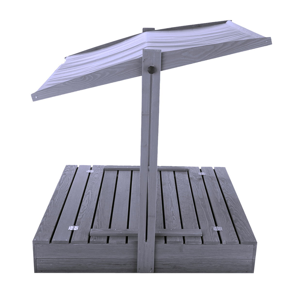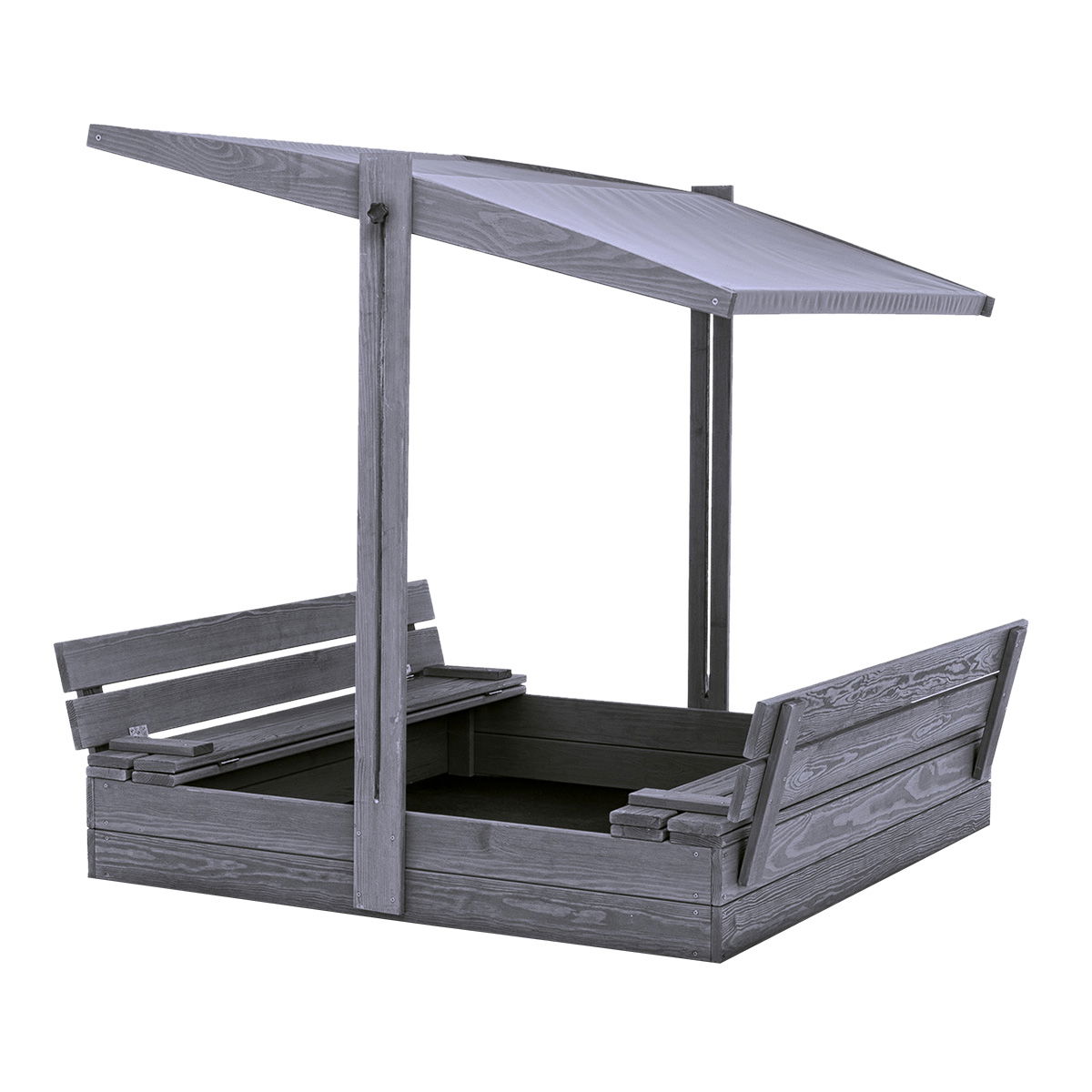 Det praktiske vippelåg omdannes nemt til to bænke, når sandkassen åbnes, hvilket giver børnene en behagelig siddeplads under legen. Det tilhørende tag kan justeres i højden og hældningen, så det altid skærmer optimalt mod solens stråler eller let regn. Hele konstruktionen er udført i robust, 100% PEFC-certificeret fyrretræ, der er grundmalet i en moderne grå farve.