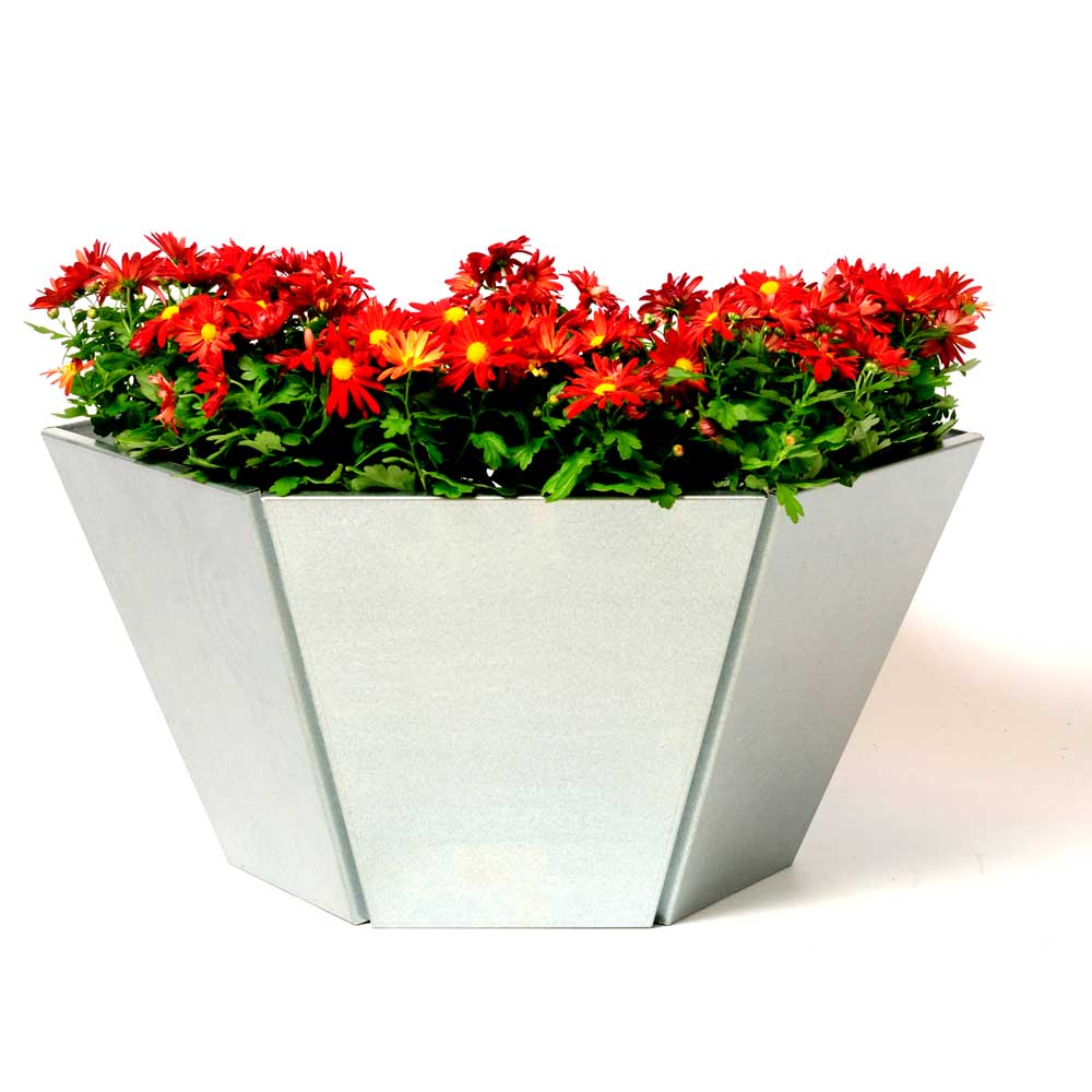 Den sekskantede krukke er en særdeles rummelig plantekumme – velegnet til alt fra blomster til buske og små træer. Den fås i galvaniseret jern og råjern, der får en smuk rusten overflade. Leveres i to størrelser: lille (højde 37 cm, diameter foroven 77 cm, diameter i bunden 47 cm) og stor (højde 53 cm, diameter foroven 87 cm, diameter i bunden 47 cm). Uden bundplade.