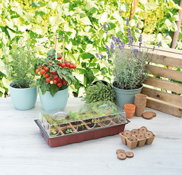 - Materiale: Genanvendt plast (bakke), biologisk nedbrydelige potter