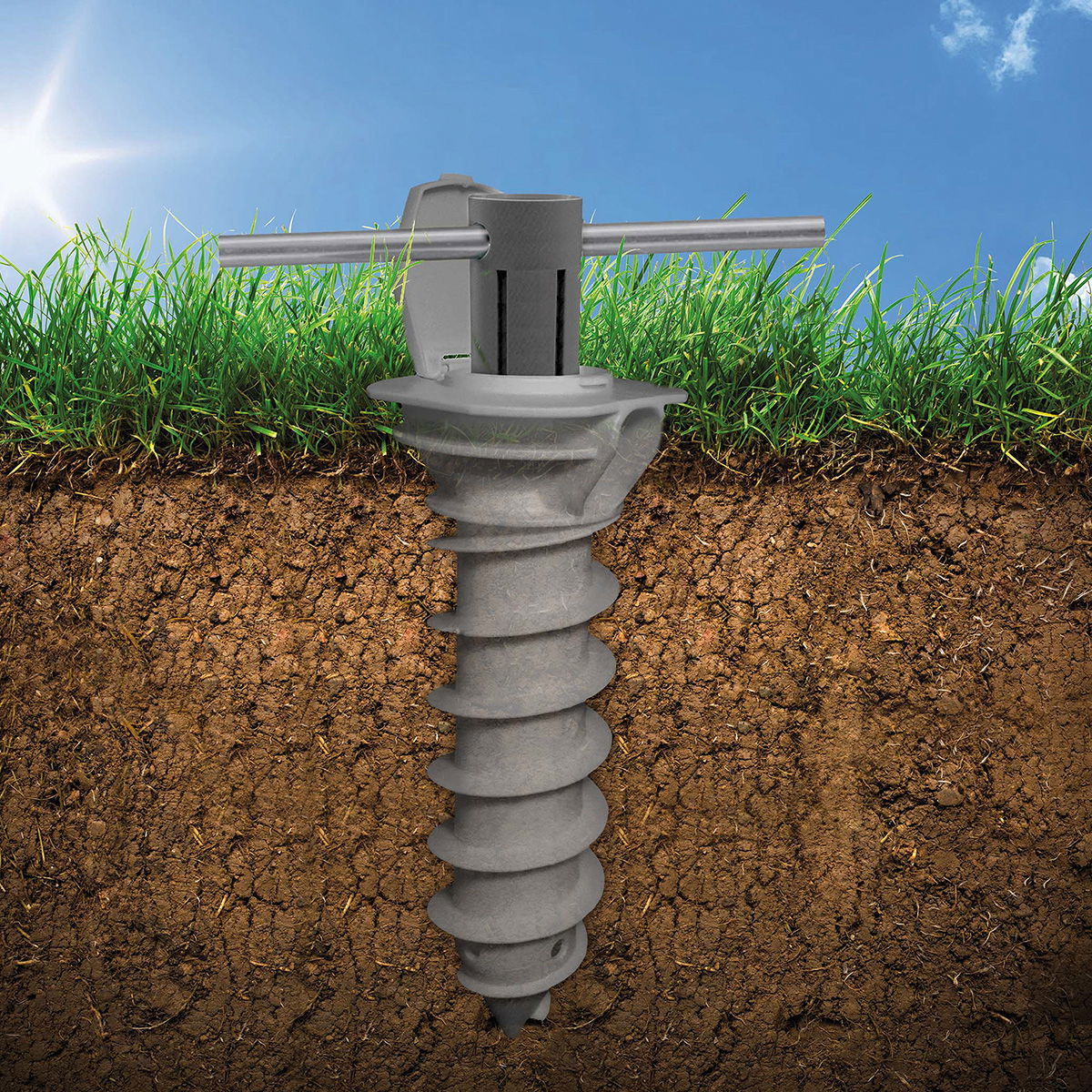 Jordskrue er en praktisk og fleksibel løsning til fastgørelse af tørrestativer, partytelte, hegn og lignende konstruktioner. Den sikrer stabil montering i jorden og kan anvendes både som midlertidig og permanent løsning.