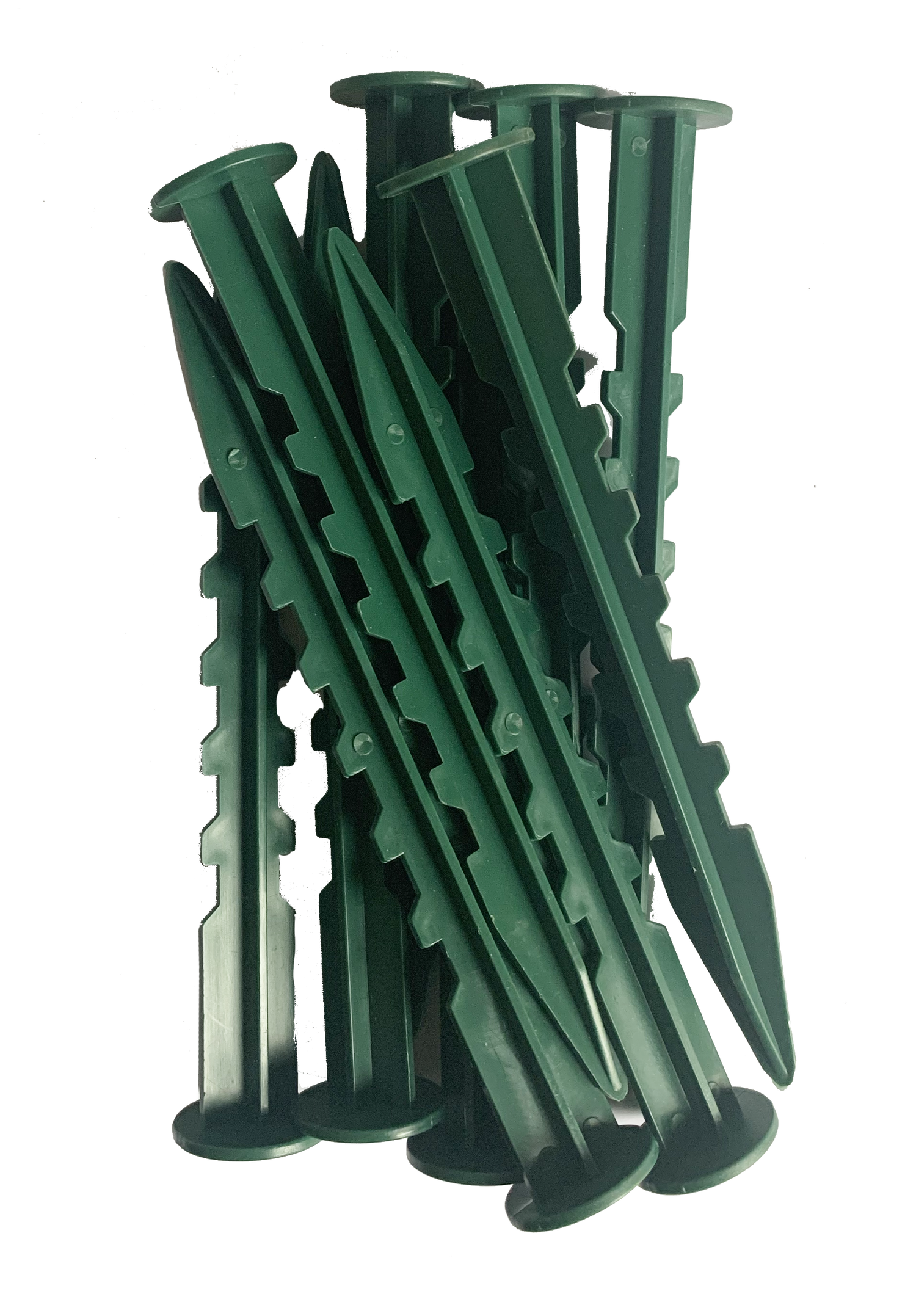 Robuste spyd fra Growers Choice til fastgørelse af ukrudtsdug. Spyddene er fremstillet i hård plastik og har en flad top, hvilket gør dem nemmere at fastgøre i jorden - eksempelvis med en gummihammer.