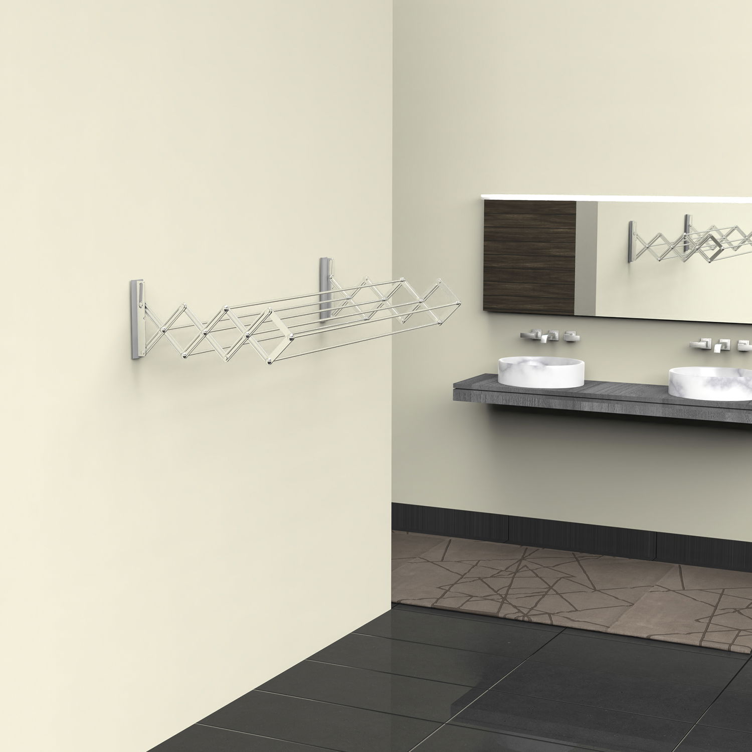 Praktisk og pladsbesparende væghængt tørrestativ fra Artweger by JUWEL udstyret med plastbelagte stålstænger og sidepanel i aluminium. Tager kun 9 cm. plads fra væggen når tørrestativet ikke er i brug.