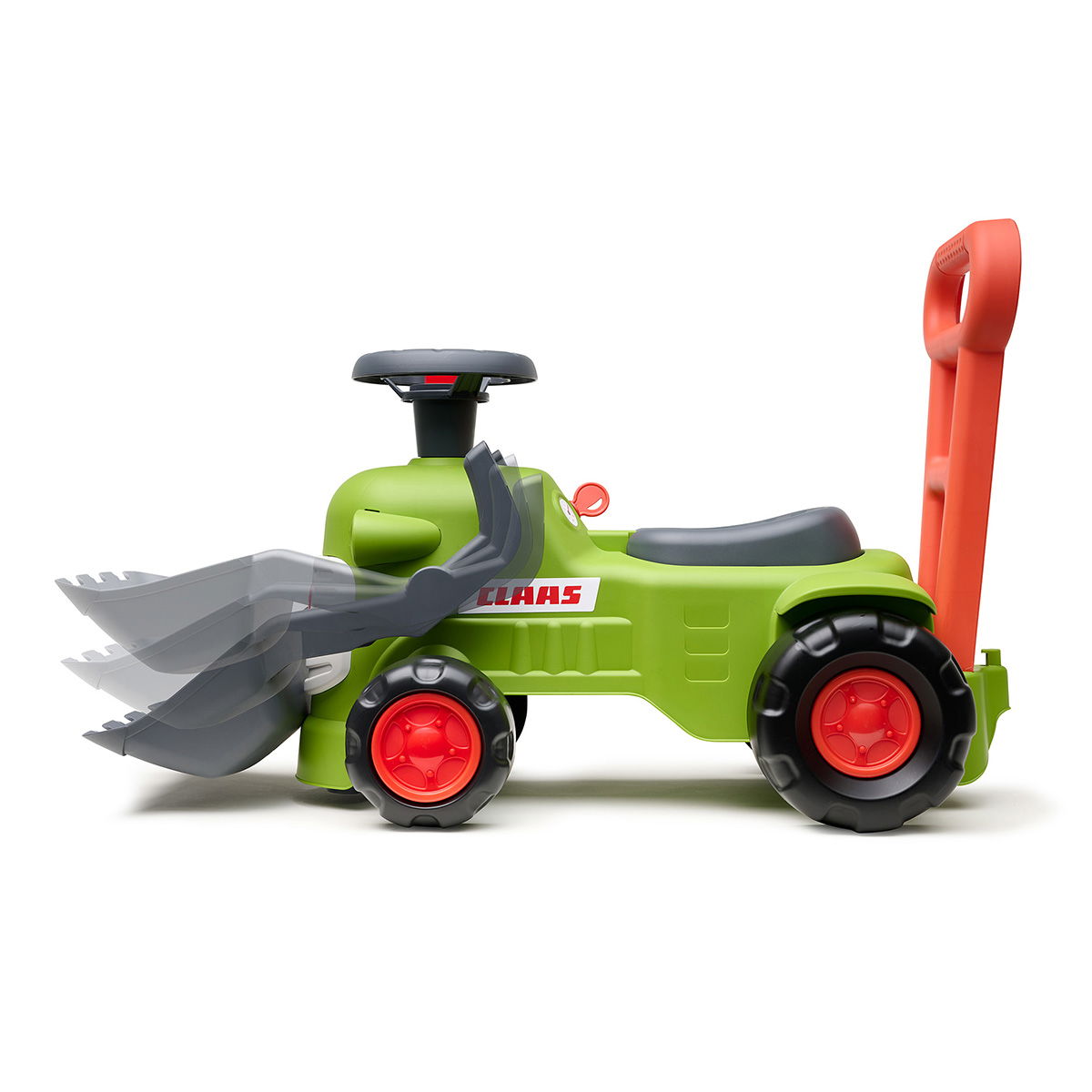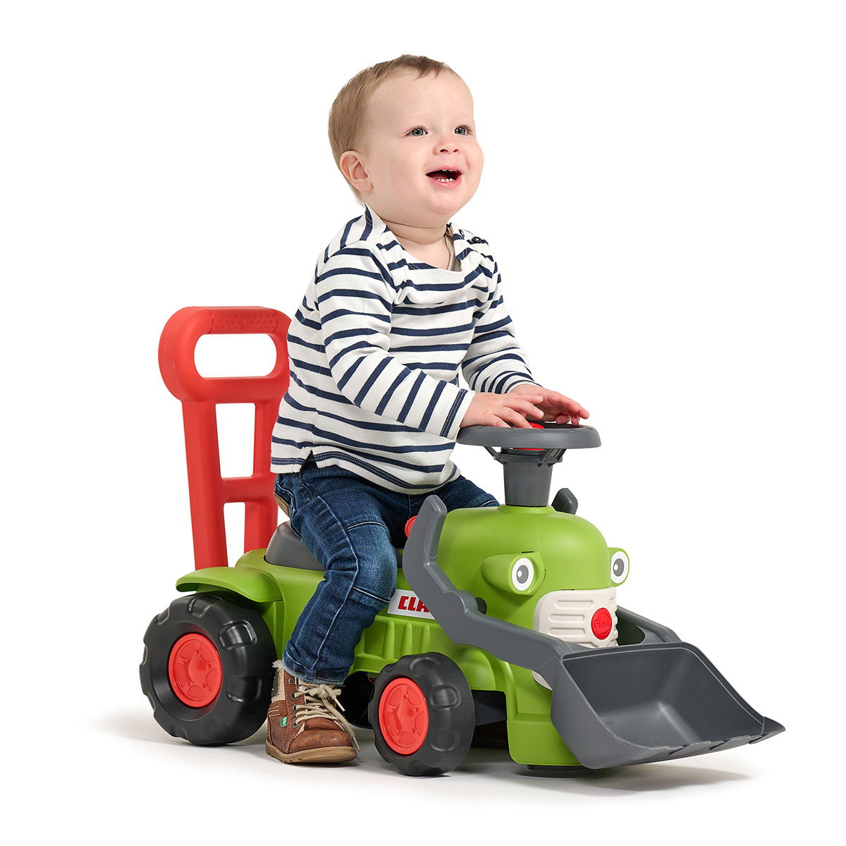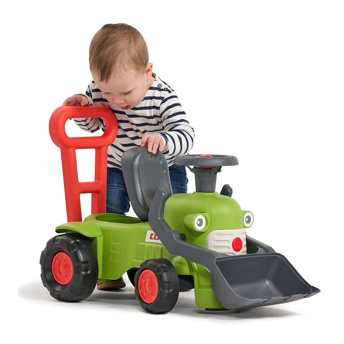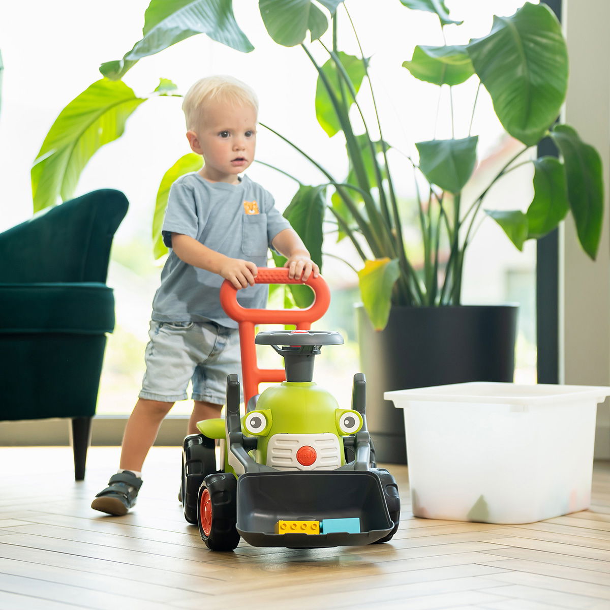 Udover at være et sjovt køretøj fungerer traktoren som en stabil gangstøtte, der giver tryghed til børn, som er ved at lære at gå. Den er udstyret med en bevægelig frontlæsser og et drejeligt rat med manuelt horn, som aktiverer barnet i timevis. Traktoren er produceret i Frankrig med fokus på bæredygtighed og består af 90 % genanvendte materialer.