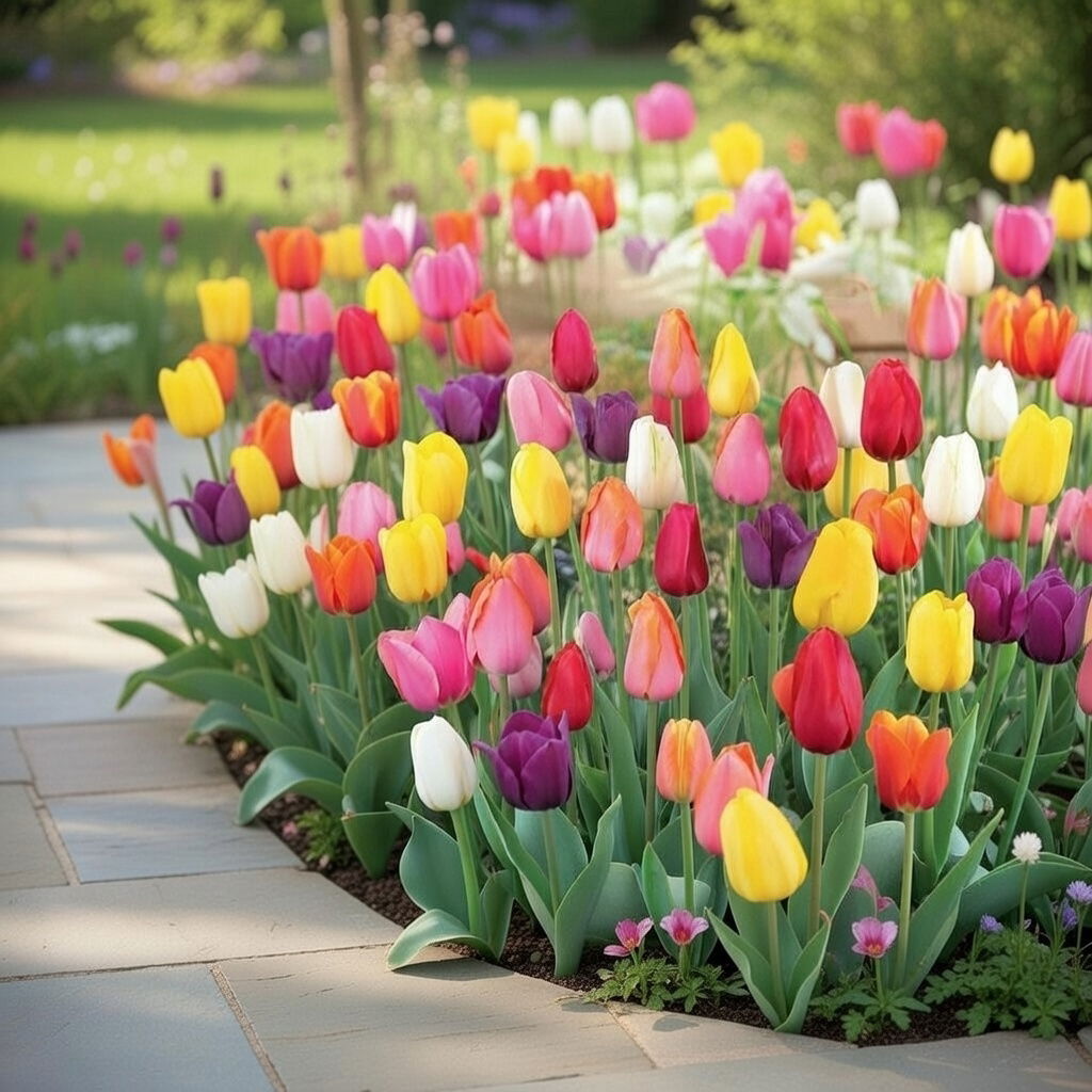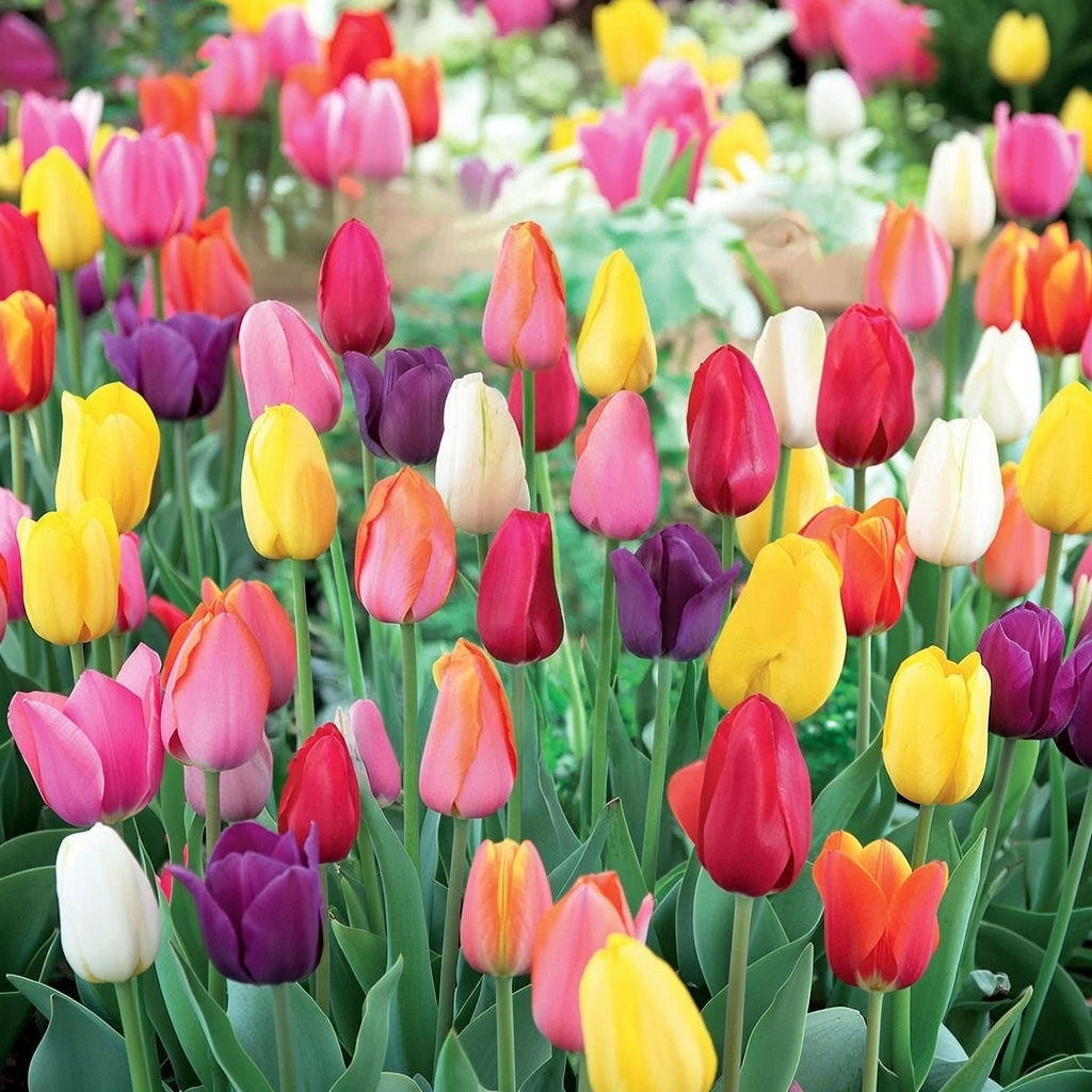 Denne blanding består af tulipaner i engelsk cottage-stil. Farverne spænder fra hvid, gul og rosa-orange til pink, violet og rød.