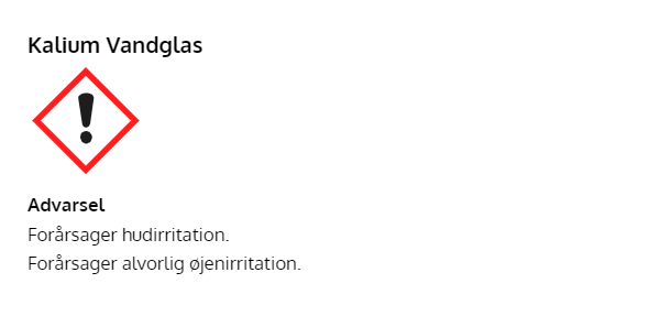 2,5 liter Kalium Vandglas 4009. PH-værdi ca. 13. Opbevares utilgængeligt for børn. Produktet fremstilles ved smeltning af sand og kaliumkarbonat.